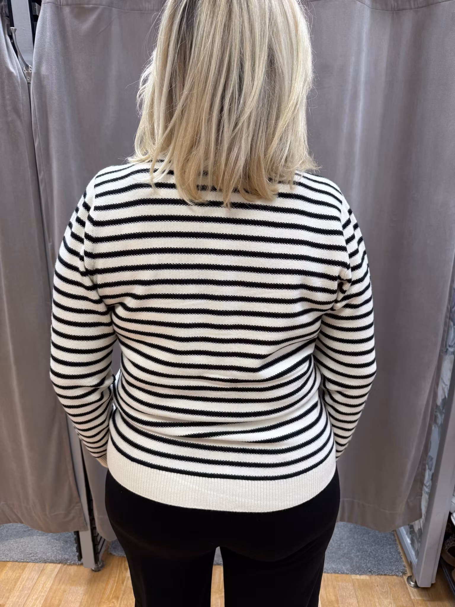 Klassisk och elegant randig stickad kofta i vitt och svart som ger ett tidlöst och stilrent uttryck. Koftan har en rak, smickrande passform och är stickad i ett mjukt och behagligt material som är skönt att bära hela dagen.