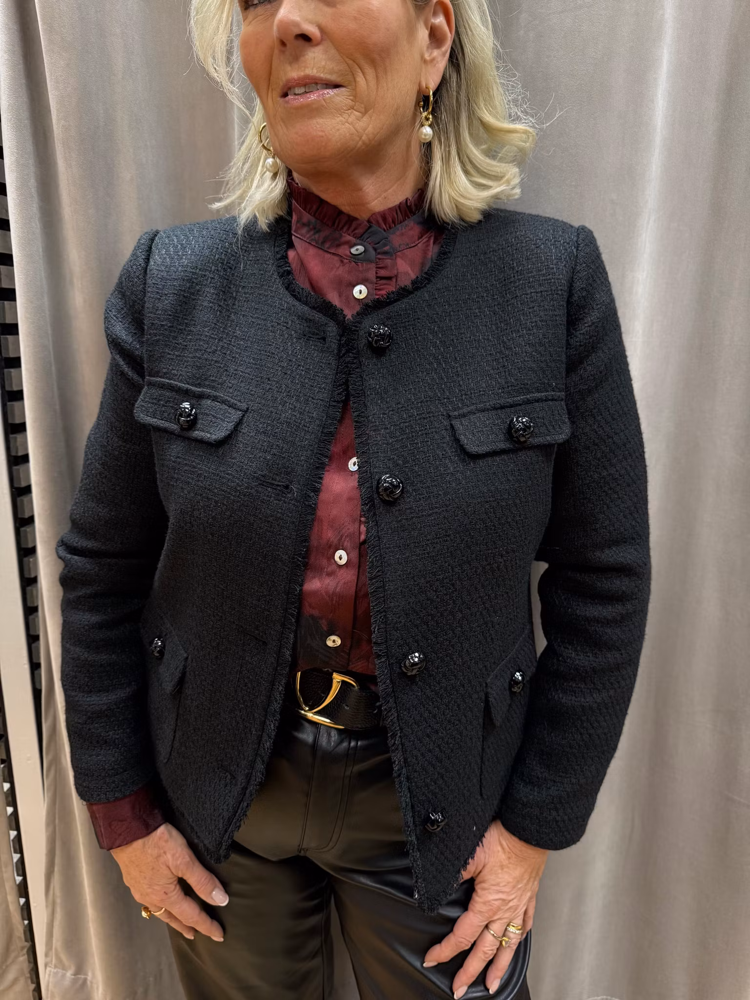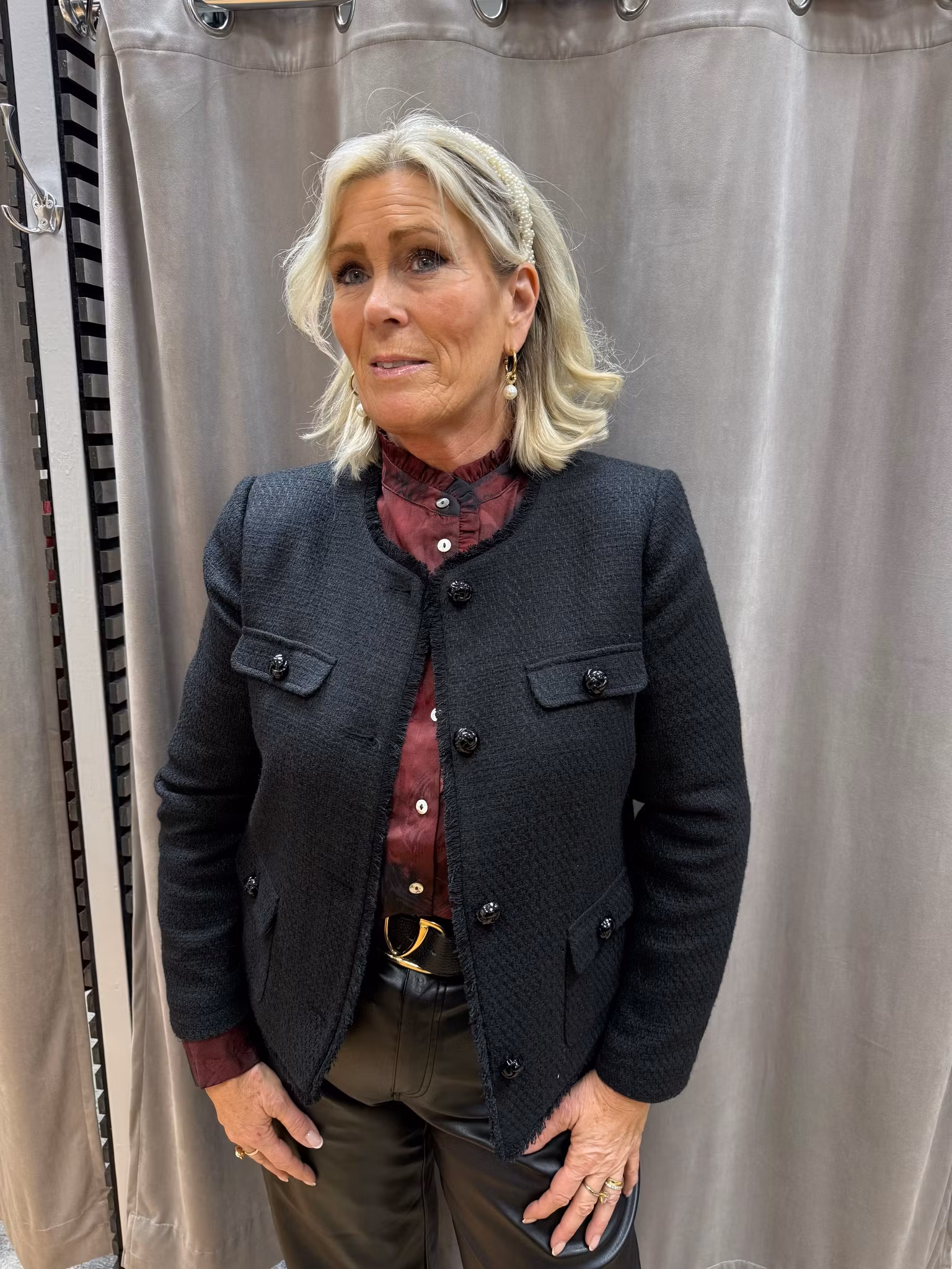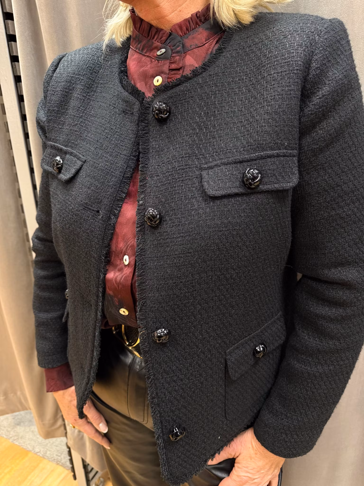 Stilren och klassisk strukturerad kort jacka som ger en elegant och välklädd look. Jackan har dekorativa fickor framtill, vackra knappar och en rak, tidlös passform som gör den enkel att kombinera med både blus, topp eller klänning. Den diskreta texturen i tyget ger ett exklusivt uttryck och gör jackan perfekt för både vardagliga och mer uppklädda tillfällen.