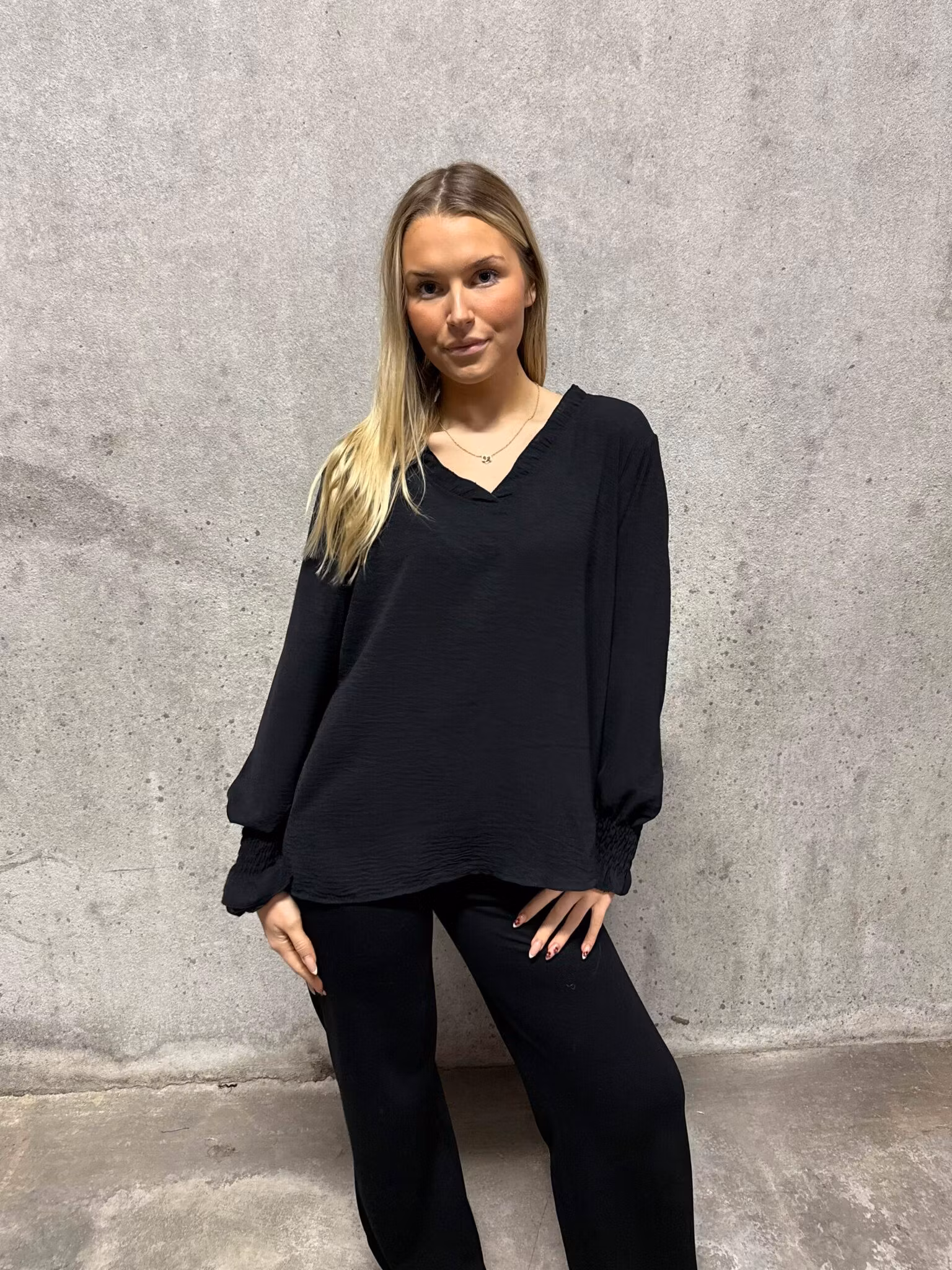 Elegant och lättburen basblus i mjuk viskosmix med vacker V-ringning och smockade ärmslut som ger en feminin och stilren silhuett. Modellen är luftig, följsam och passar lika bra till vardag som till fest.
