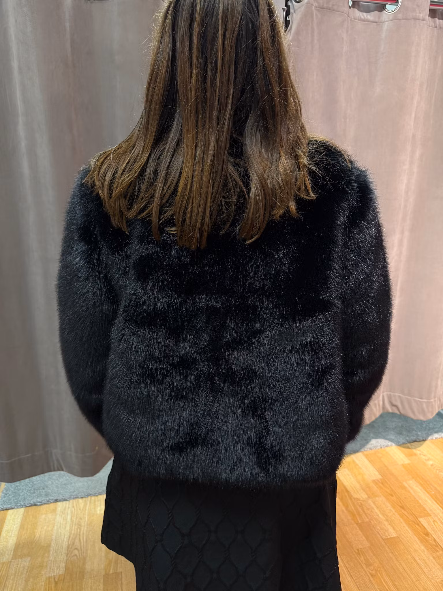 Denna svarta fuskpälsjacka är den perfekta kombinationen av klassisk elegans och modern komfort. Tillverkad i mjuk, tät och glansig fuskpäls av hög kvalitet, ger den ett lyxigt uttryck samtidigt som den håller dig varm under kalla dagar.