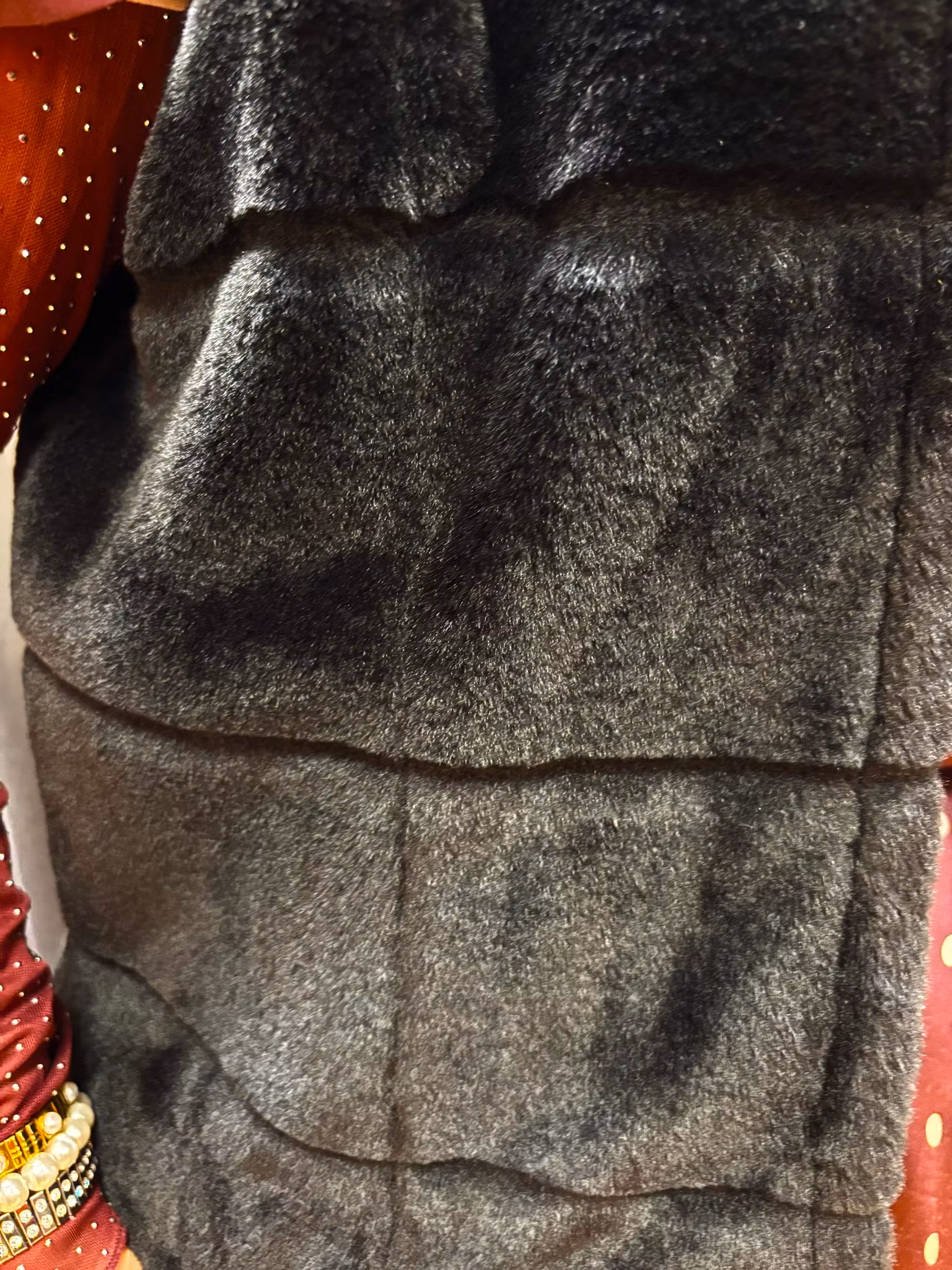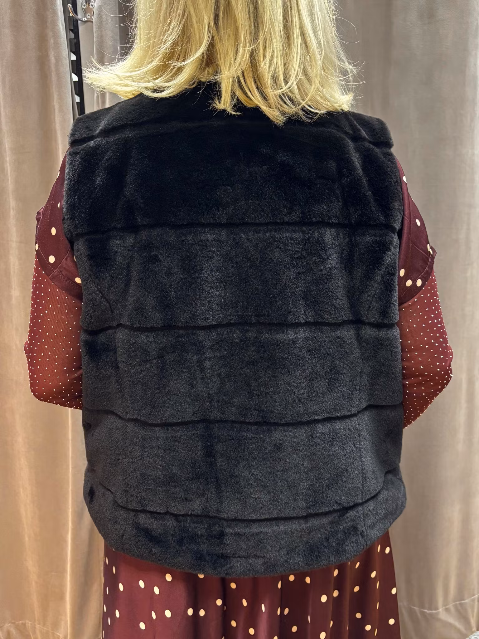 Ge din outfit en elegant och lyxig känsla med denna mjuka svart fuskpälsväst. Västen är tillverkad i ett fluffigt och värmande material som ger en sofistikerad look och passar perfekt både till vardags och fest. Den är lätt att kombinera med klänningar, blusar eller tröjor och skapar en stilsäker lager-på-lager-effekt.