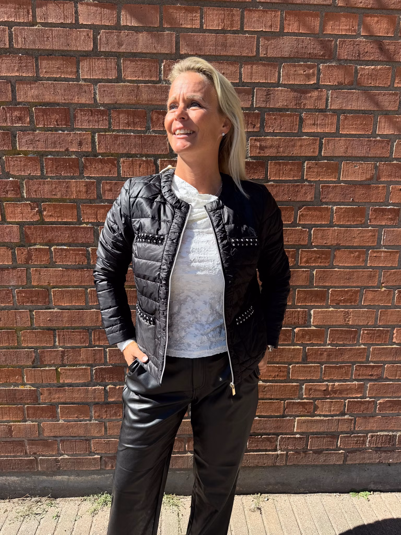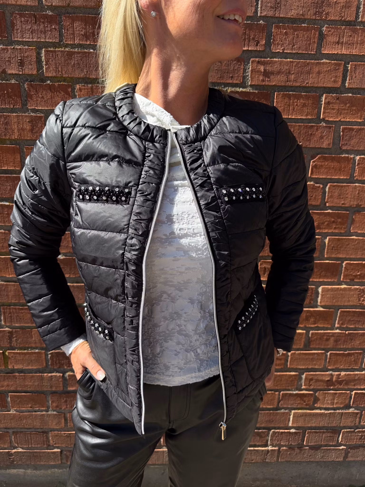 Svart quiltad jacka med pärldetaljer. Stilfull och modern svart quiltad jacka med dekorativa pärl- och paljettdetaljer på fickor och bröstparti. Jackan har figurnära passform, rund halsringning och dragkedja framtill. Perfekt för både vardag och fest när du vill ha en lätt men elegant ytterjacka. Bär den till jeans, kjol eller skinnbyxor för en chic look.