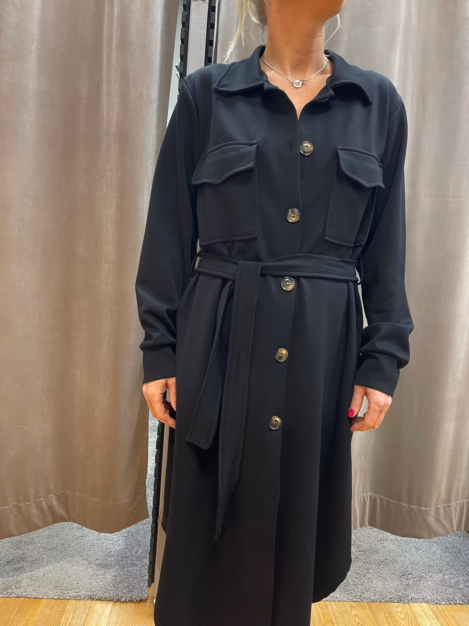 Mjuk kappa i följsamt material med en stilren och tidlös design. Modellen har klassisk krage, knäppning framtill och dekorativa bröstfickor som ger ett genomarbetat uttryck. Kappan är lätt figursydd och har ett avtagbart knytband i midjan som gör det enkelt att justera passformen. Lång ärm och generös längd ger ett elegant fall och gör plagget perfekt som ett bekvämt ytterlager för både vardag och arbete. En mångsidig kappa som kombinerar komfort med ett välklätt intryck.