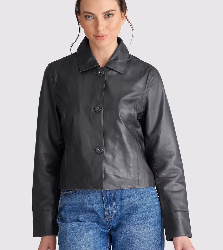 En elegant svart skinnjacka i klassisk modell med knappar och mjukt lammskinn i tidlös passform. Materialet ger en exklusiv känsla och är enkel att matcha till både klänning och jeans för en stilren look. Perfekt höst- och vårjacka!