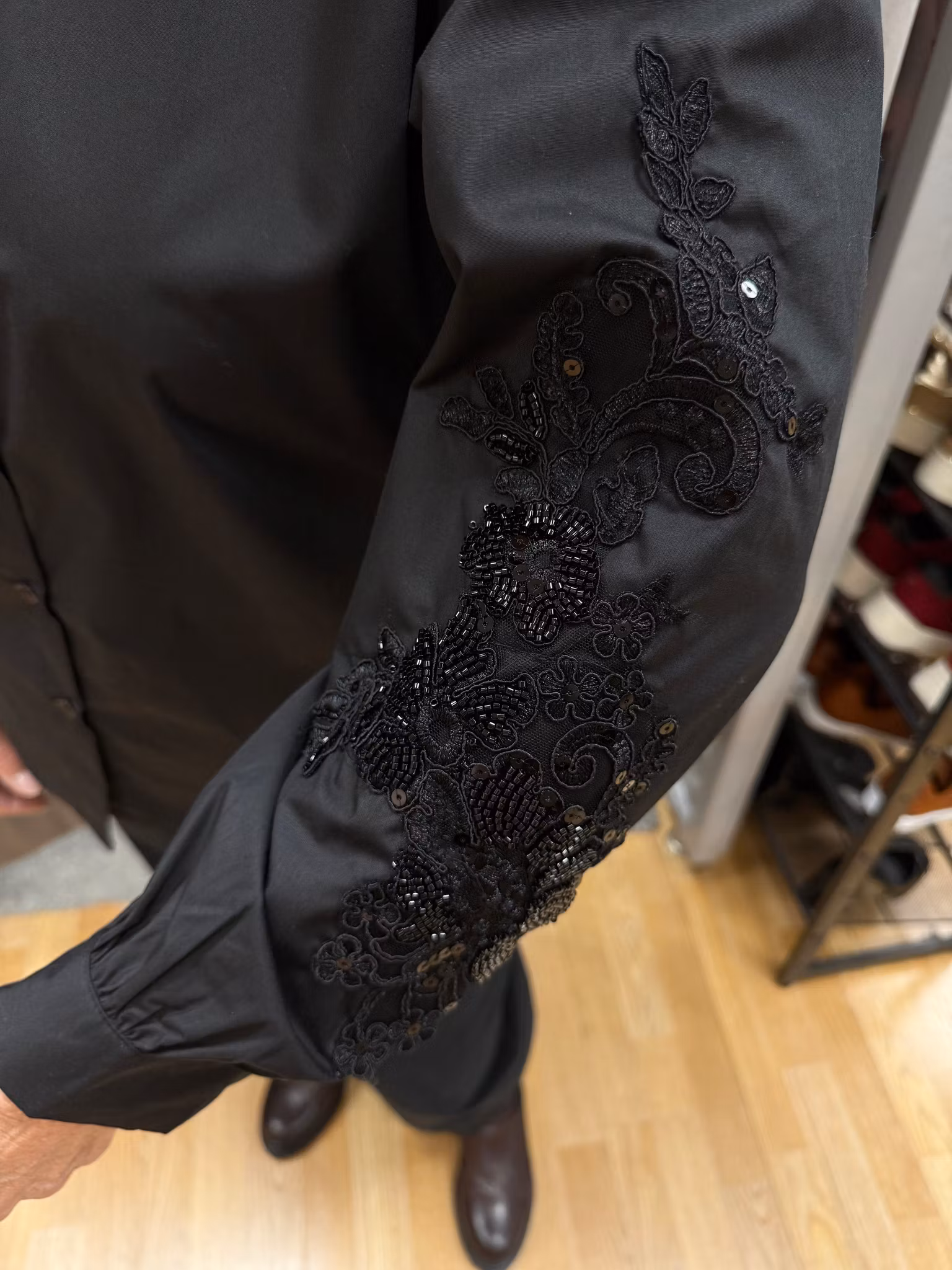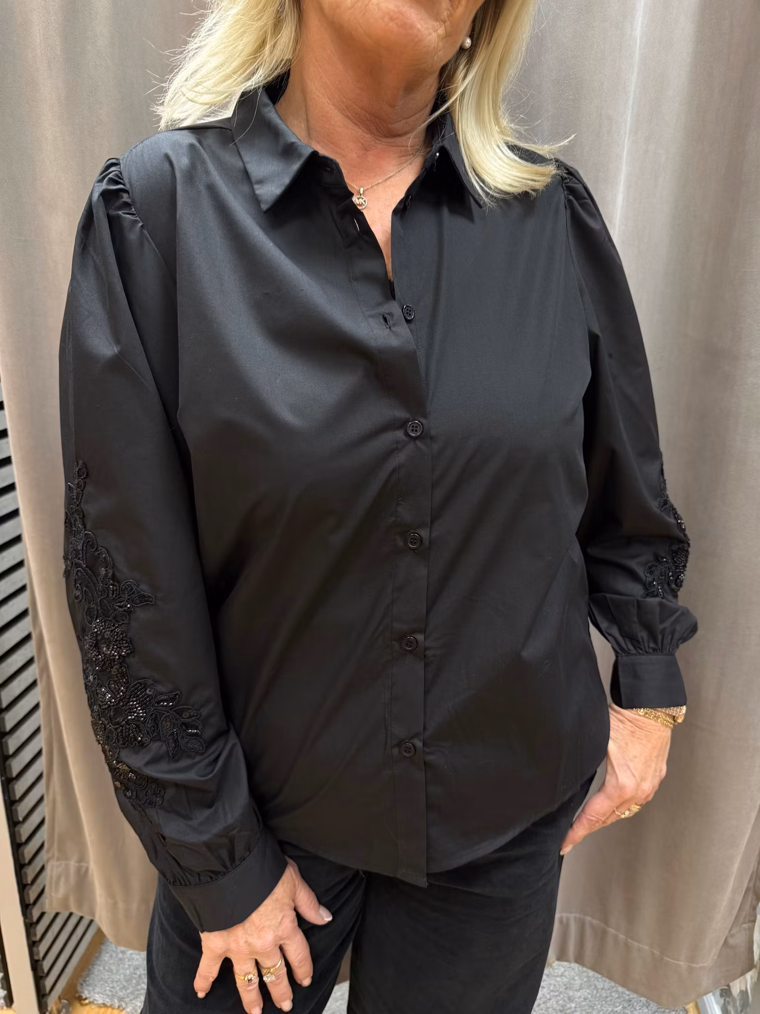 Exklusiv svart skjorta med vackra broderade detaljer på ärmarna. De blommiga mönstren är dekorerade med pärlor och paljetter som ger ett elegant och glittrande intryck. Skjortan har klassisk krage, knappstängning framtill och manschetter med knapp. En perfekt kombination av tidlös stil och lyxig detaljrikedom – lika snygg till jeans som till festbyxor.