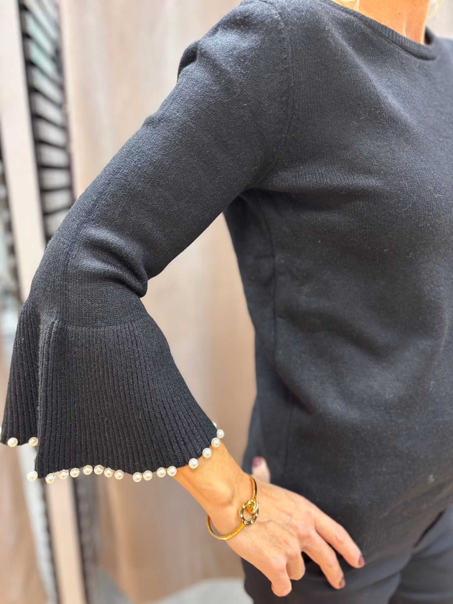 Elegant stickad tröja med feminina detaljer. Tröjan har rund halsringning och lätt utsvängda ärmar dekorerade med vackra pärlor längs fållen. Den mjuka, stretchiga kvaliteten gör den bekväm och perfekt för både vardag och fest. En stilren topp med det lilla extra som passar till både kjol och byxor.