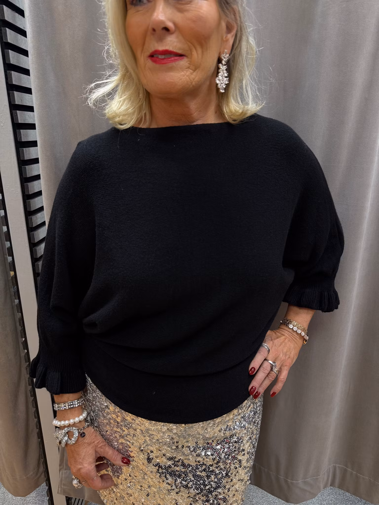 Elegant svart stickad tröja med trekvartsärm och diskreta volangdetaljer vid ärmslut. Den mjuka kvalitén ger en smickrande passform och gör tröjan perfekt att kombinera både till vardags och fest. Matcha gärna med en paljettkjol för en lyxig look eller bär den till byxor för en mer avskalad stil. Ett tidlöst basplagg som passar alla säsonger och kan stylas på många sätt.