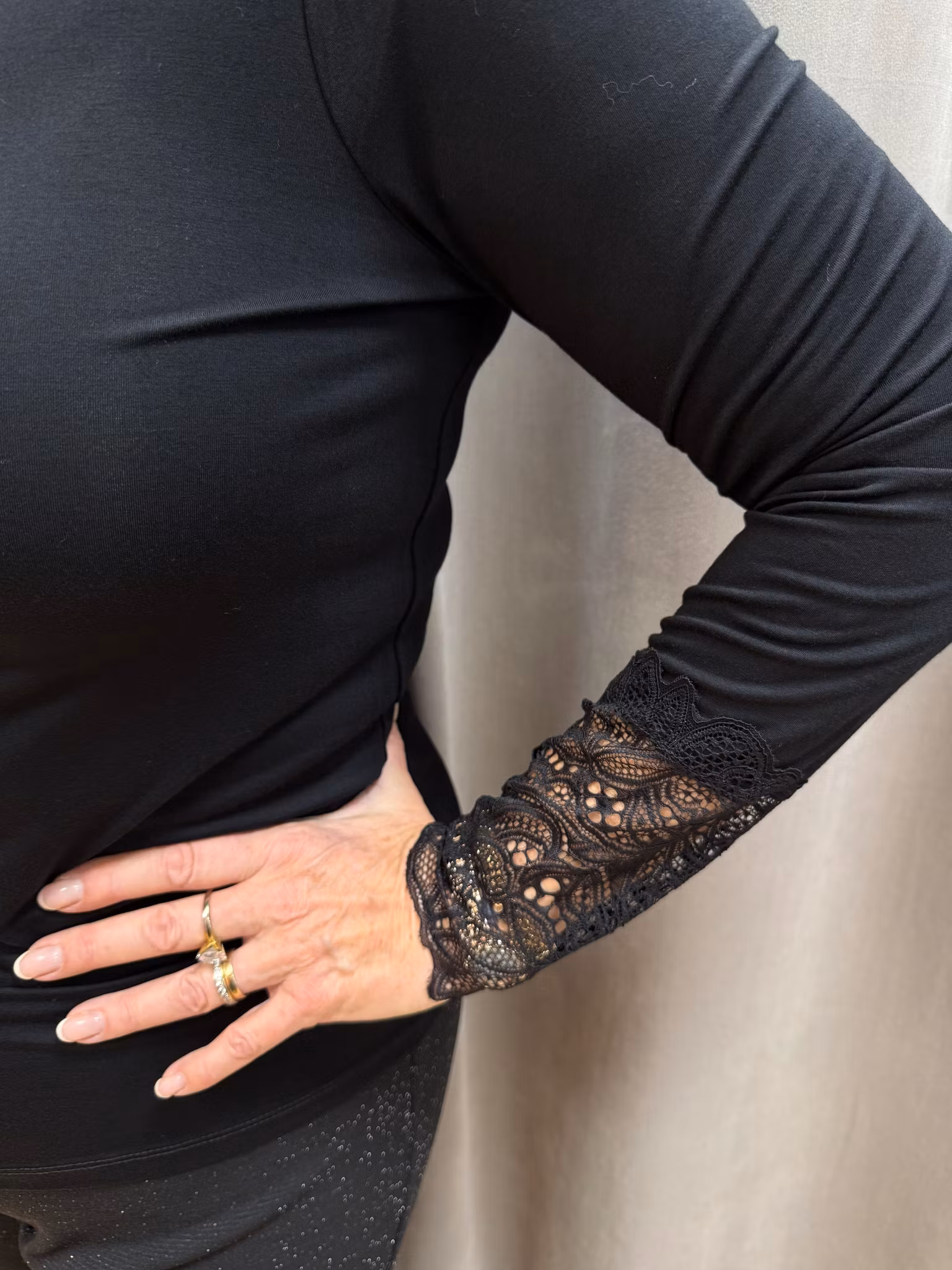 Elegant och mångsidig svart topp från Soyaconcept, designad med fokus på både stil och komfort. Toppen har en klassisk rund halsringning och långa ärmar som avslutas med vackra spetsdetaljer i ett blommigt mönster – en feminin touch som gör plagget perfekt för både vardag och fest. Den mjuka, stretchiga kvaliteten ger en smickrande passform och hög komfort hela dagen.