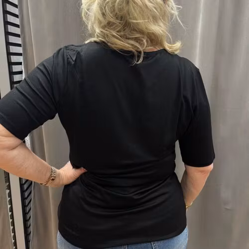 REA - Svart topp med strass 449 kr Produkten är tyvärr slut i lager. Lagersaldo: Artikelnummer: 103 Leverantör: Gabriella K Produktbeskrivning En v-ringad topp i svart med med strass/stenar.Modellen är 172 cm och bär storlek 44.Material: 92% viskos, 8% elastan