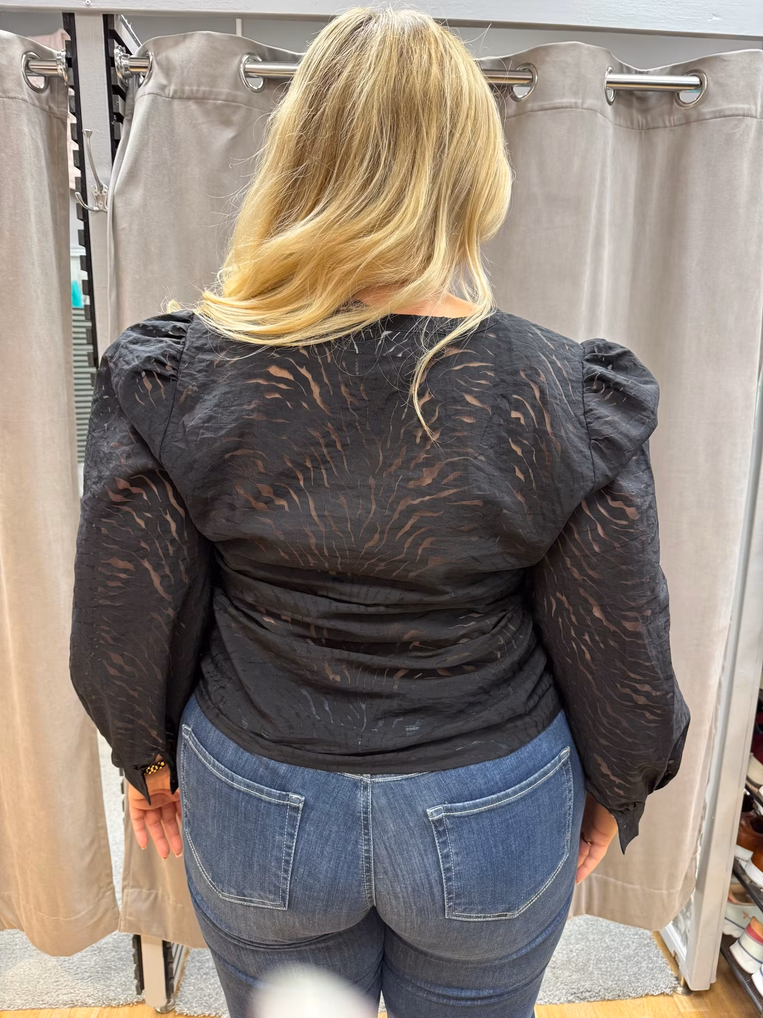 Denna svarta blus med transparent mönster i ton-i-ton är både trendigt elegant och mångsidig. Blusen har en lätt v-ringning, långa puffärmar med manschett samt ett vackert strukturmönster som gör den stilfull och modern.
