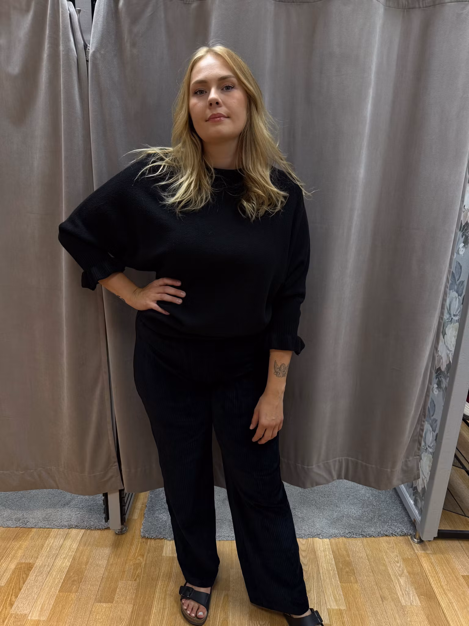 Svart stickad tröja med rund halsringning och avslappnad passform. Ärmarna har en fin detalj i form av ribbade muddar med diskret volangkant som ger en mjuk och feminin touch. En bekväm och stilren tröja som enkelt kan kläs upp eller ner beroende på tillfälle.