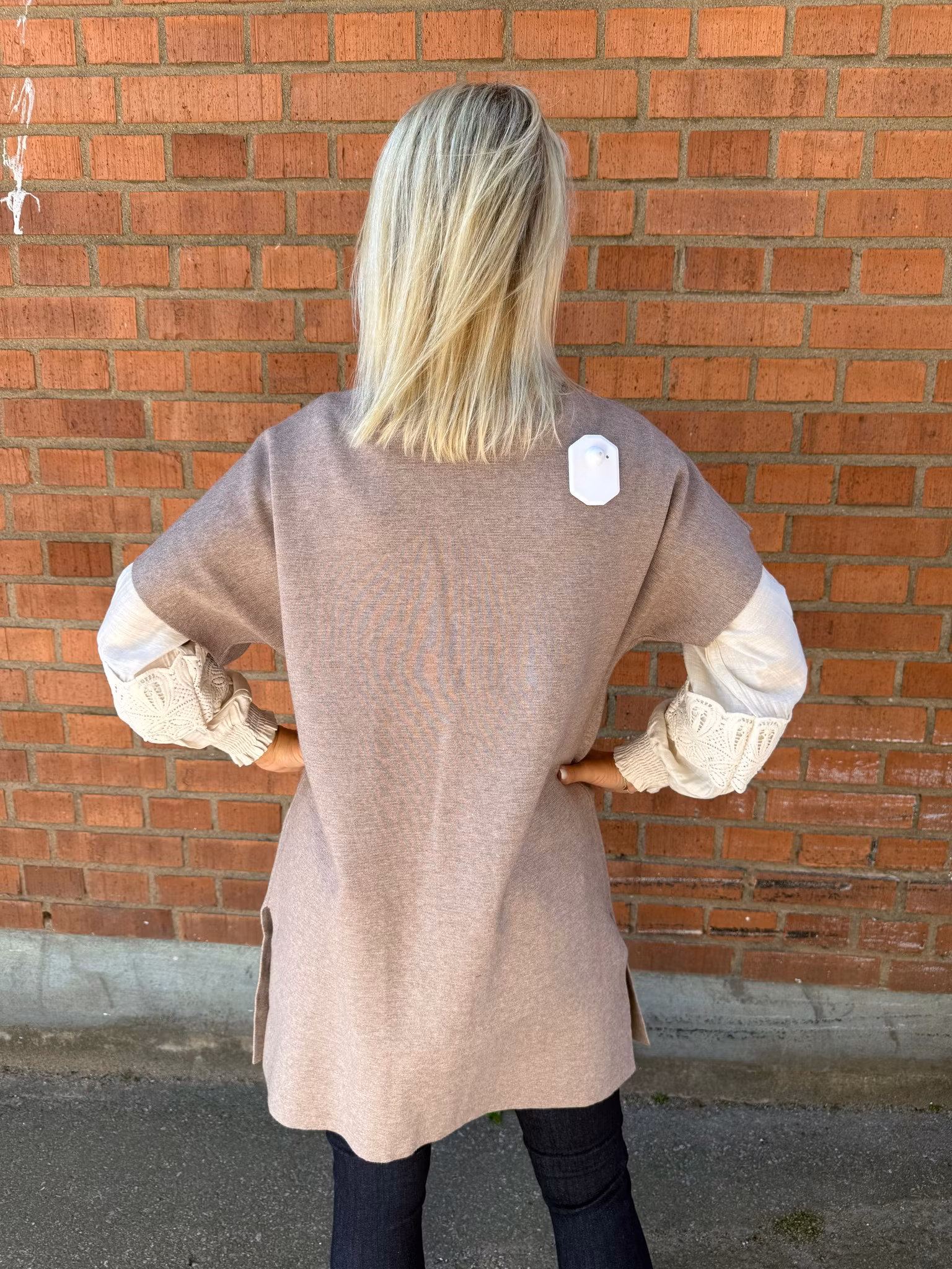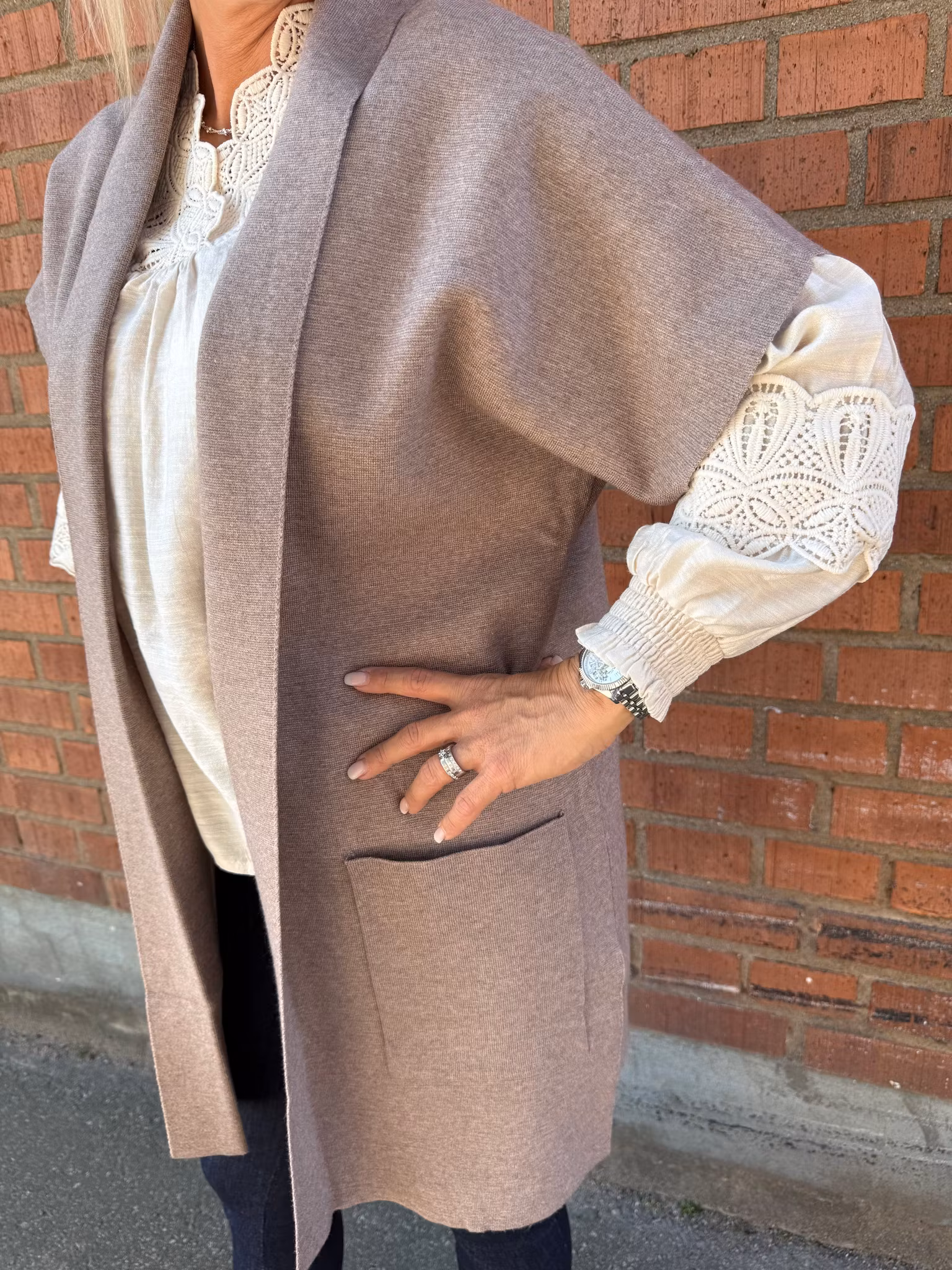 Lång öppen kofta i beige. Mjuk och tidlös beige kofta i längre modell utan knäppning. Designad med rak passform, kortare ärm och djupa fickor fram, vilket gör den både praktisk och stilren. Perfekt att bära över en blus, topp eller klänning för en vardaglig lager-på-lager-look eller som ett elegant alternativ till jacka under mildare dagar.