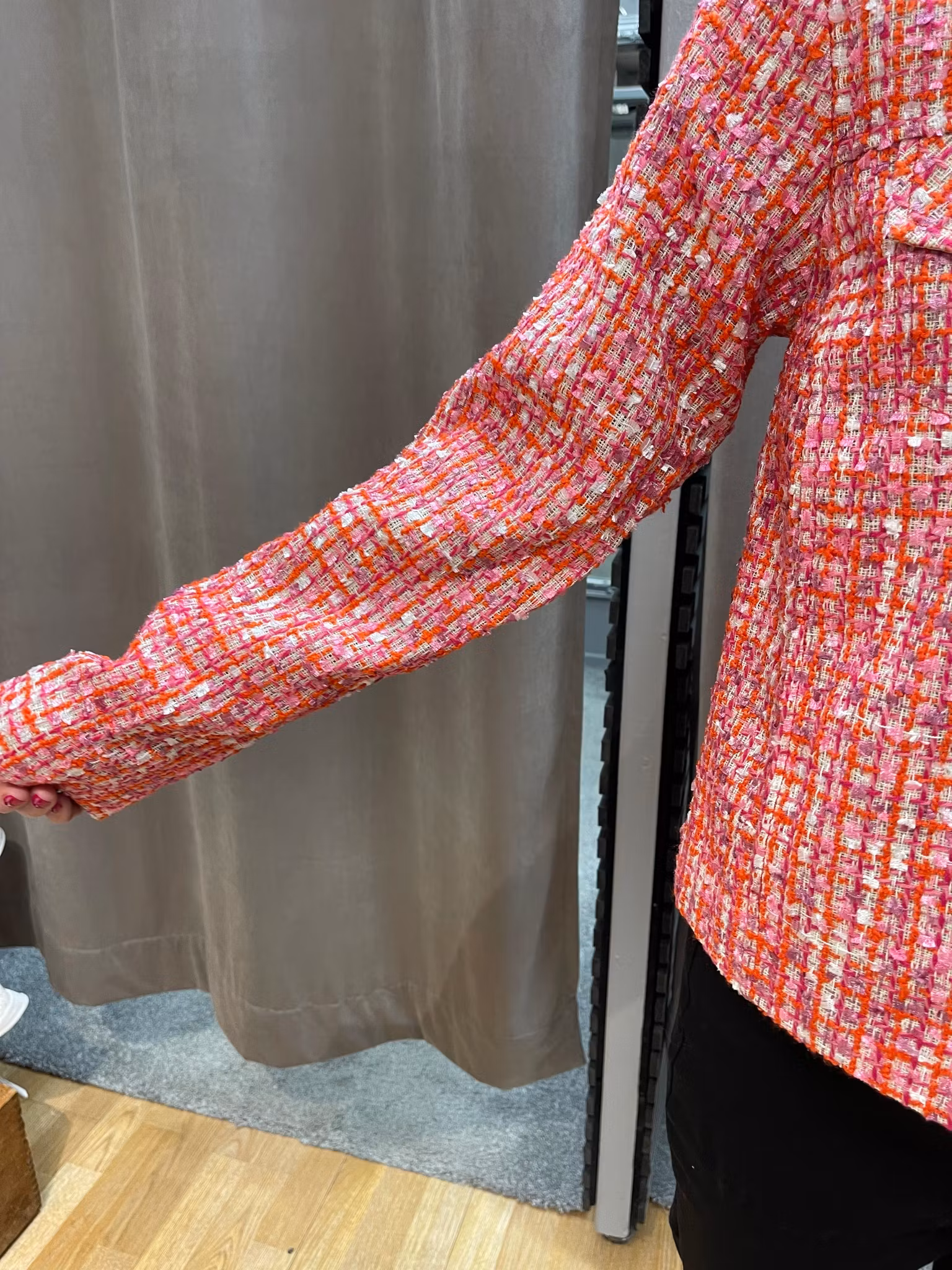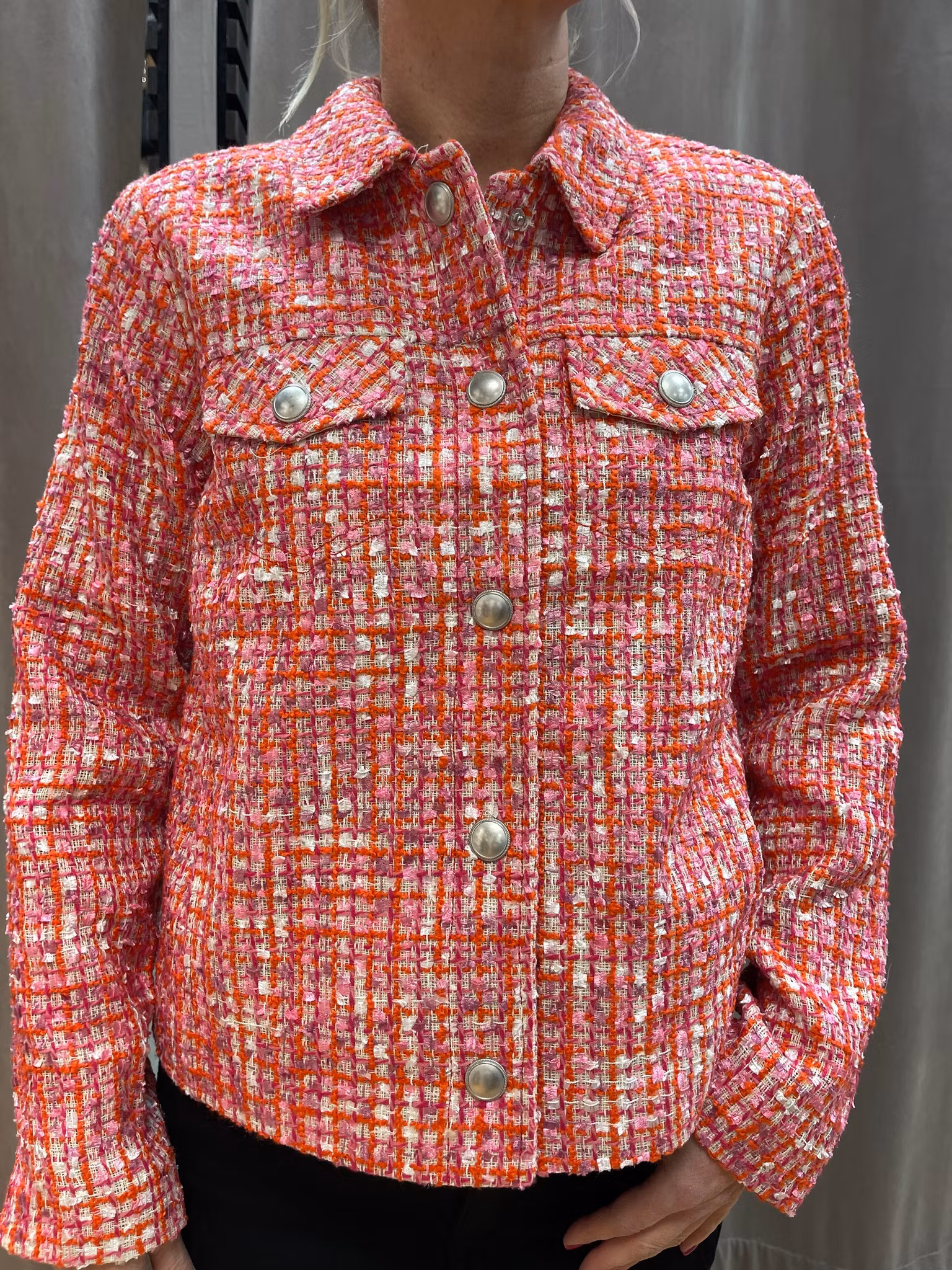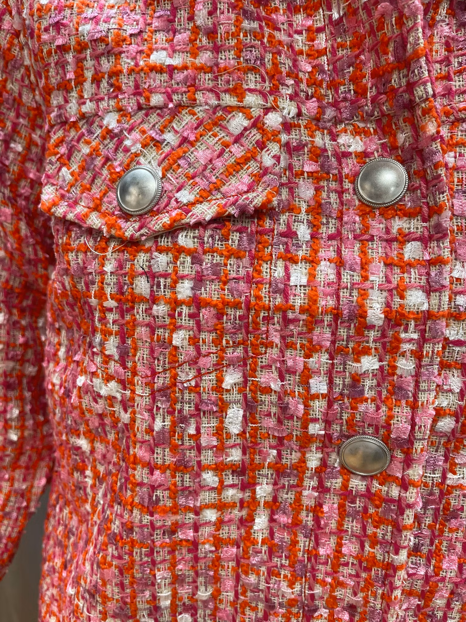 Elegant och trendig jacka i en vacker boucléväv med nyanser av rosa, rött och vitt. Modellen har en klassisk krage, dekorativa bröstfickor och silverfärgade knappar som ger ett exklusivt uttryck. Jackan är lätt figursydd och passar perfekt både till vardag och festligare tillfällen. Styla den med jeans för en avslappnad look eller över en klänning för en mer sofistikerad känsla. Ett tidlöst plagg som lyfter vilken outfit som helst.
