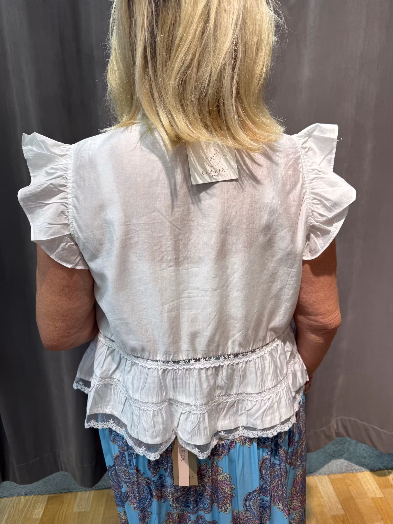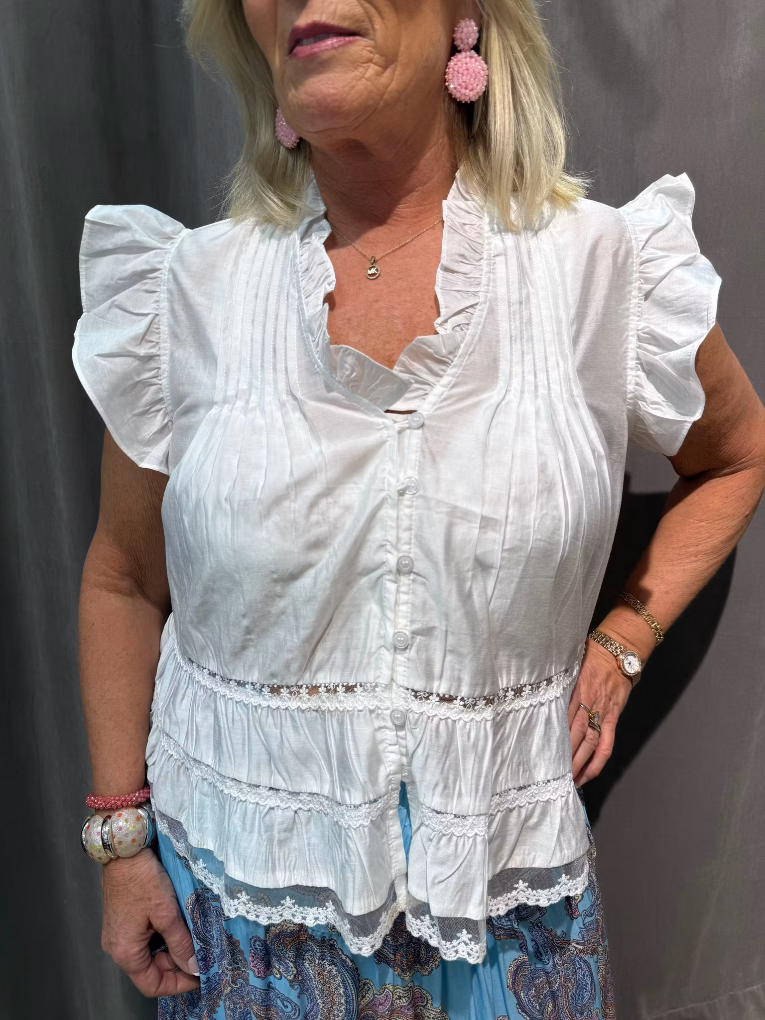 De korta ärmarna med volang ger ett mjukt och luftigt fall, medan spetsdetaljer och volanger nedtill tillför en extra feminin känsla. Knäppningen framtill gör blusen både praktisk och dekorativ.