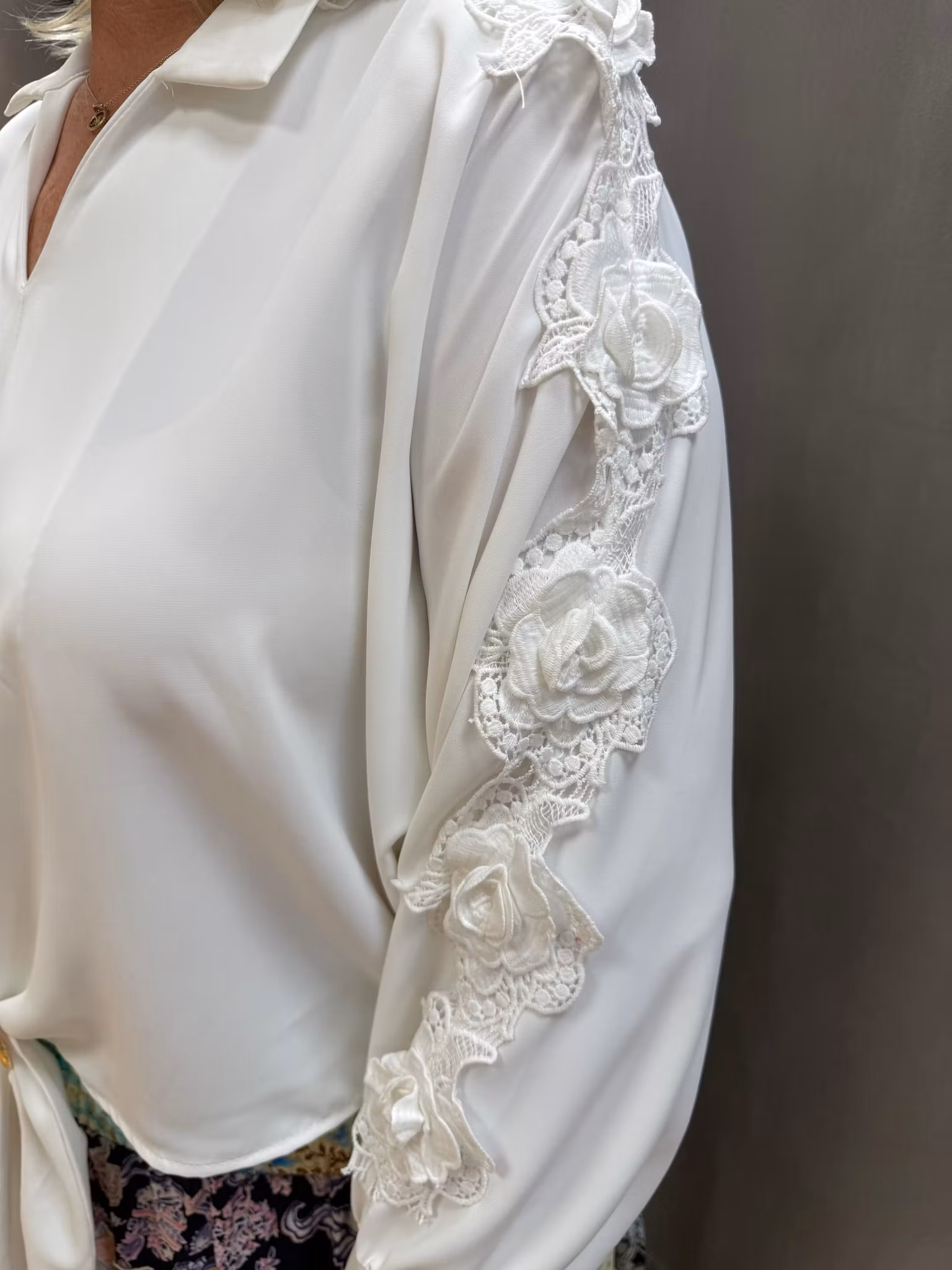 Stilren och elegant blus i klassiskt vitt med vackra spetsdetaljer längs ärmarna som ger en romantisk och exklusiv känsla. Blusen har en avslappnad passform med krage och V-ringning samt ett dekorativt knyt framtill med ringdetalj som skapar en smickrande siluett.