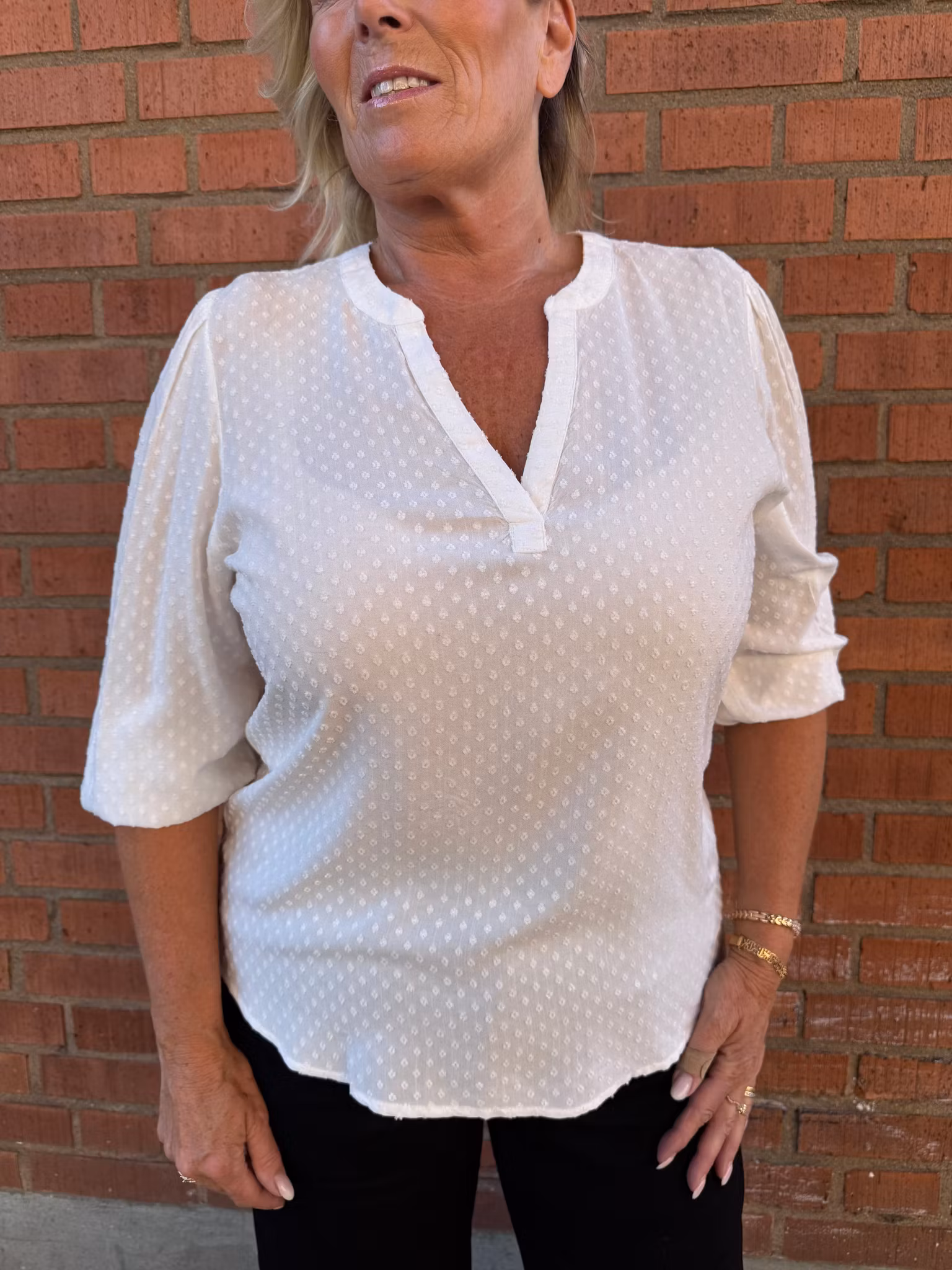 Vit elegant blus i med diskret strukturmönster. V-ringad halsringning och 3/4-ärmar med lätt puff ger en feminin och stilren siluett. Passar lika bra till vardags som till fest.