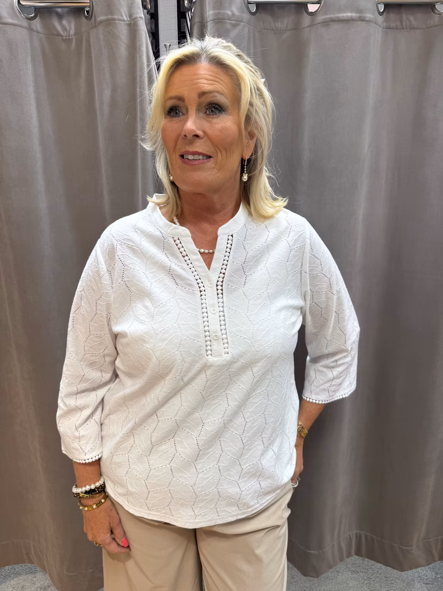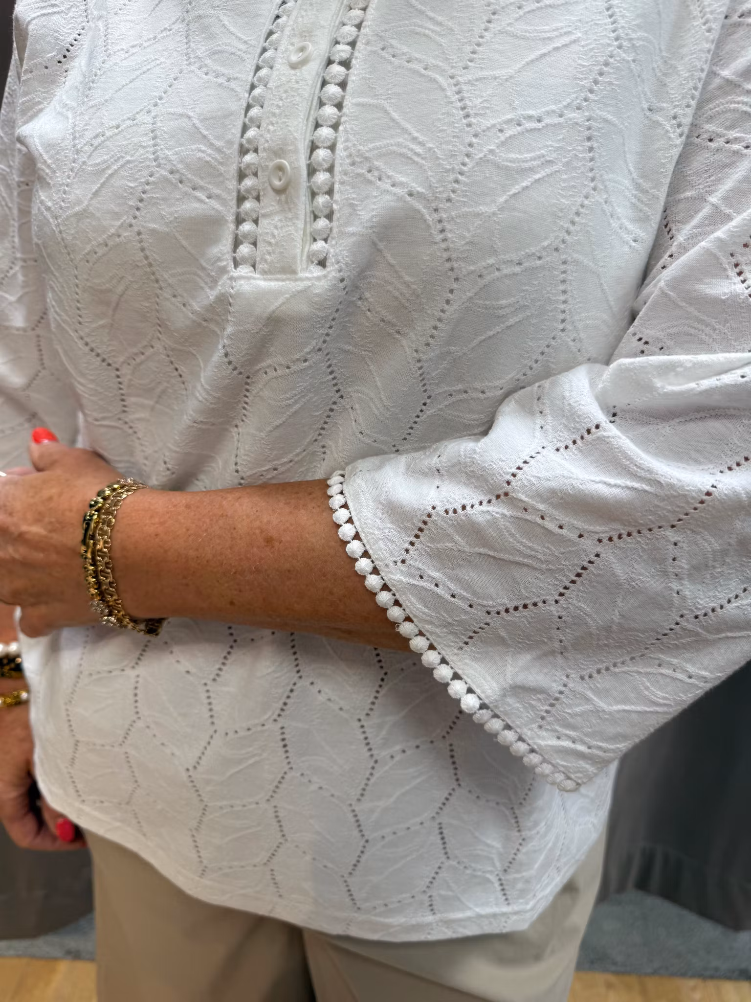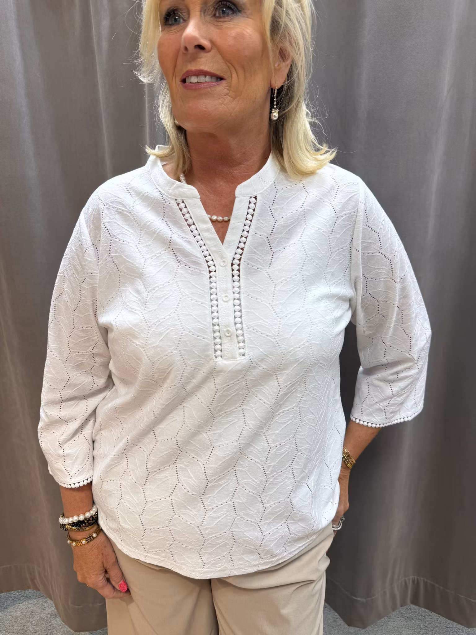 En elegant och tidlös vit topp med vackert strukturmönster som ger plagget ett exklusivt och feminint uttryck. Den har en dekorativ V-ringning med knappdetaljer och fina kantband som ramar in halsringningen på ett stilfullt sätt.