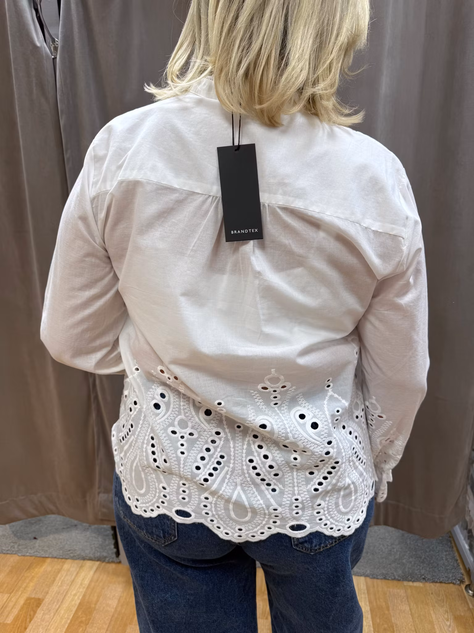 Den genombrutna broderien nertill ger ett exklusivt och feminint uttryck, perfekt för både vardag och festligare tillfällen. En klassisk krispigt vit nyans som är enkel att matcha med jeans, linnebyxor eller kjol.