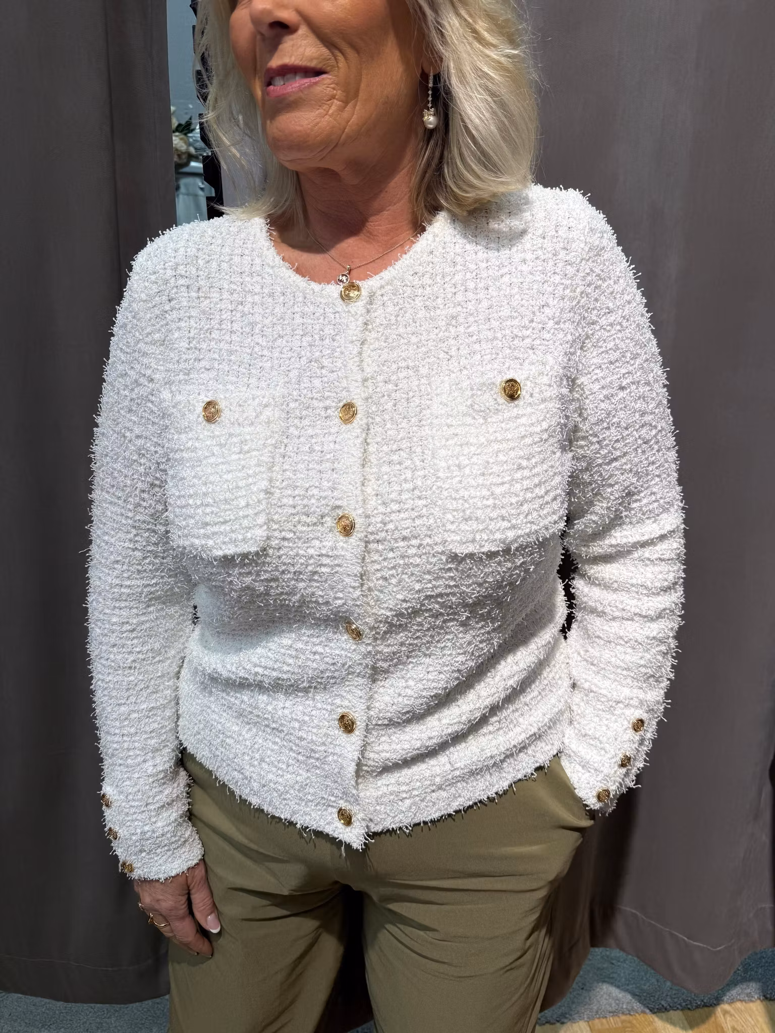 En elegant och tidlös stickad kofta i en mjuk off-white nyans som passar perfekt i varje garderob. De dekorativa guldknapparna framtill ger plagget en feminin och exklusiv känsla, samtidigt som den klassiska designen gör koftan enkel att styla till många olika outfits.