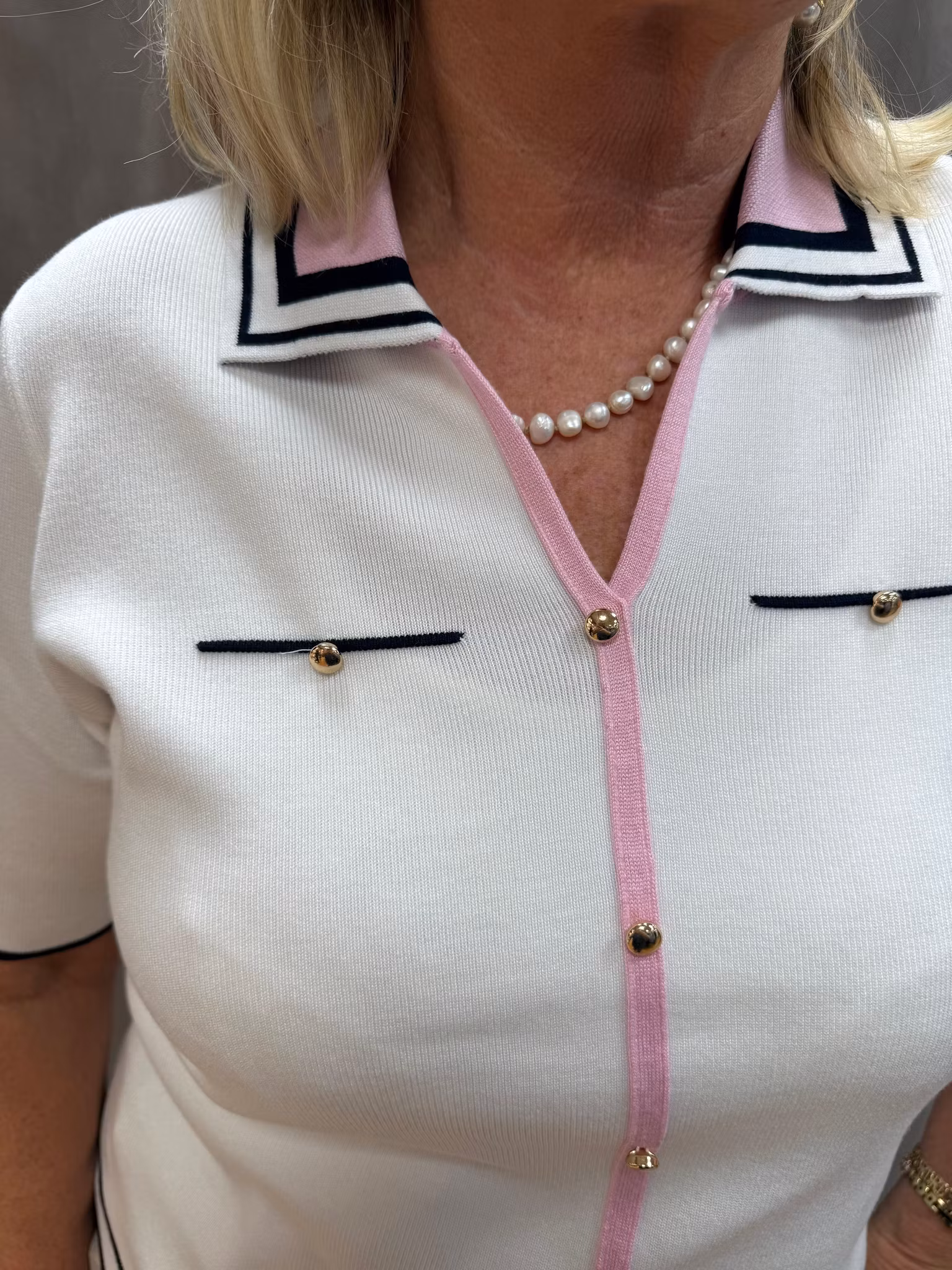 En stilren och feminin stickad topp med exklusiva kontrastdetaljer som ger ett elegant och sportigt uttryck. Den klassiska kragen ramas in av dekorativa ränder och följs av en markerad knäppning framtill med guldfärgade knappar som ger en lyxig känsla.