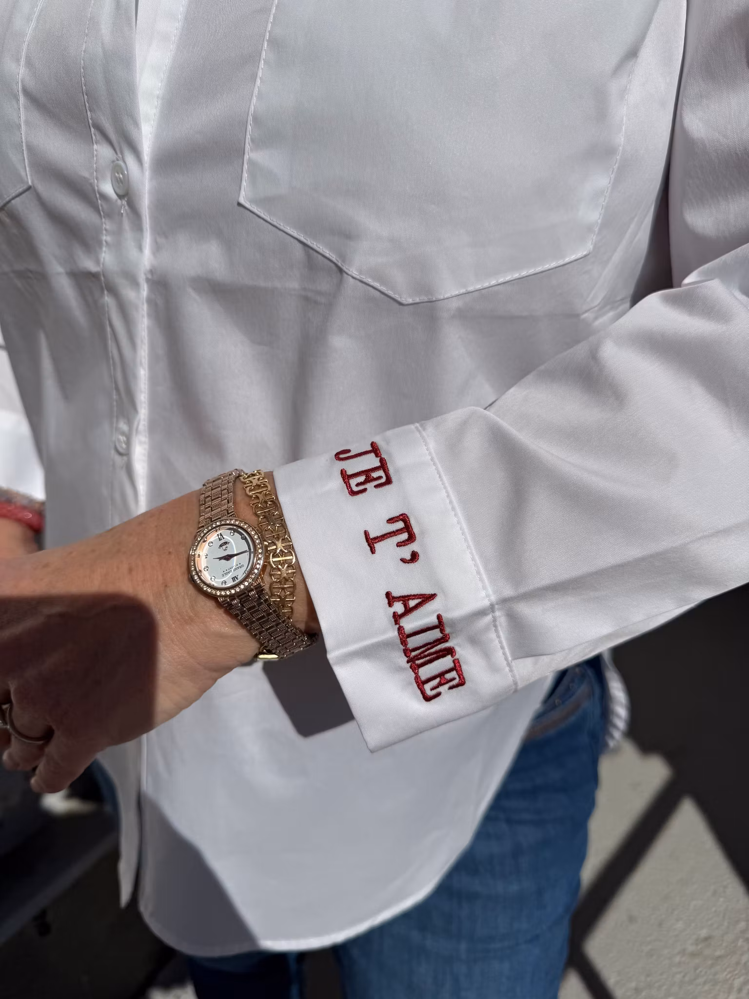 Skjortan har en något längre bakdel och rundad nederkant som ger ett fint fall och gör den lika snygg att bära instoppad som utanpå. Bröstfickor framtill adderar en diskret detalj, och den broderade texten vid ärmslutet ger en unik och personlig touch.