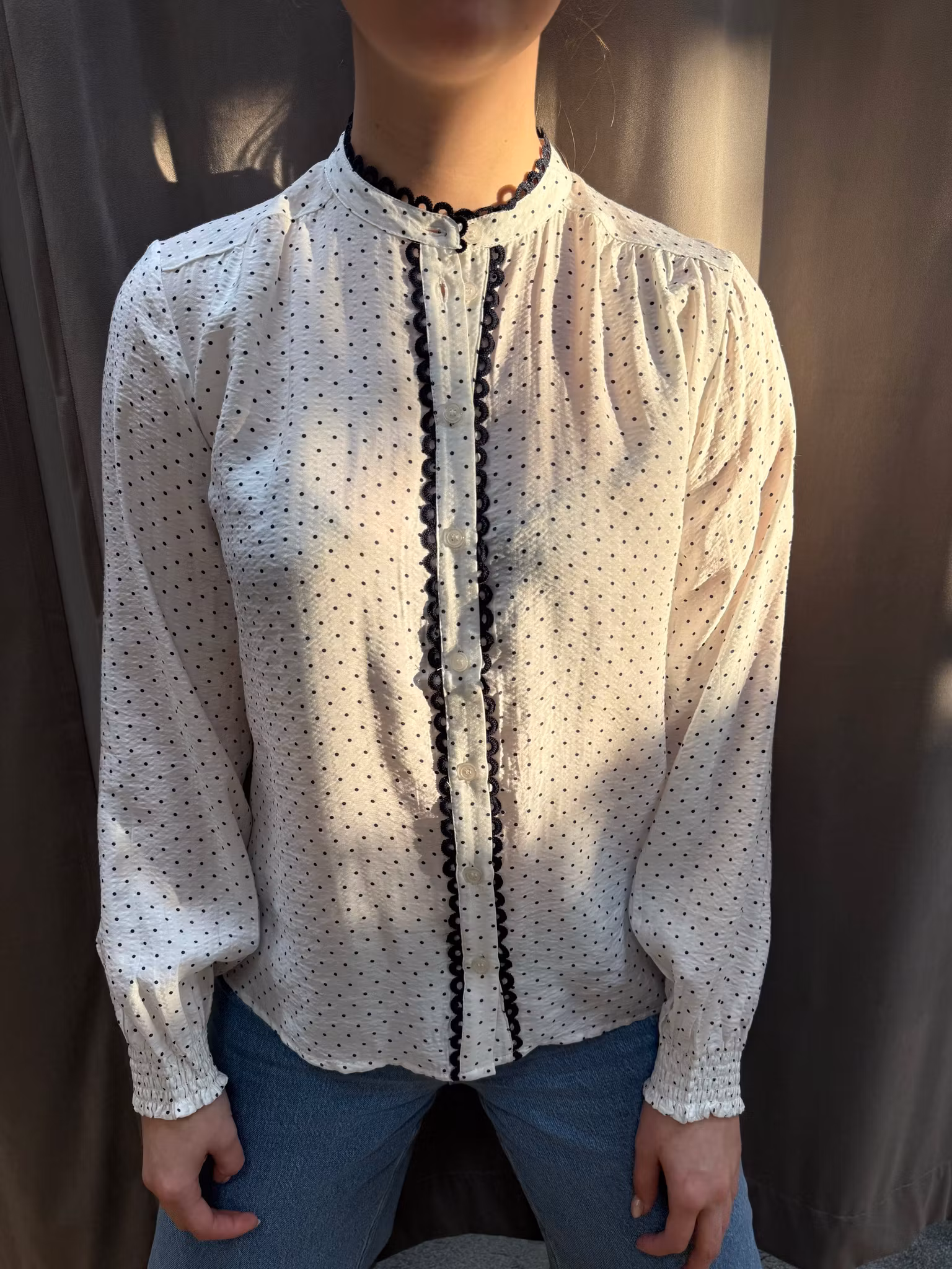 Lätt och feminin blus med lång ärm och ståkrage. Modellen har en rak, något lös passform som faller mjukt över kroppen. Små prickar i tyget ger ett levande uttryck och framtill finns en knäppning som ramas in av dekorativ spetsdetalj. Ärmsluten har lätt resår som skapar ett fint fall och gör blusen bekväm att bära. En tidlös blus som fungerar lika bra till vardag med jeans som till en mer uppklädd look.