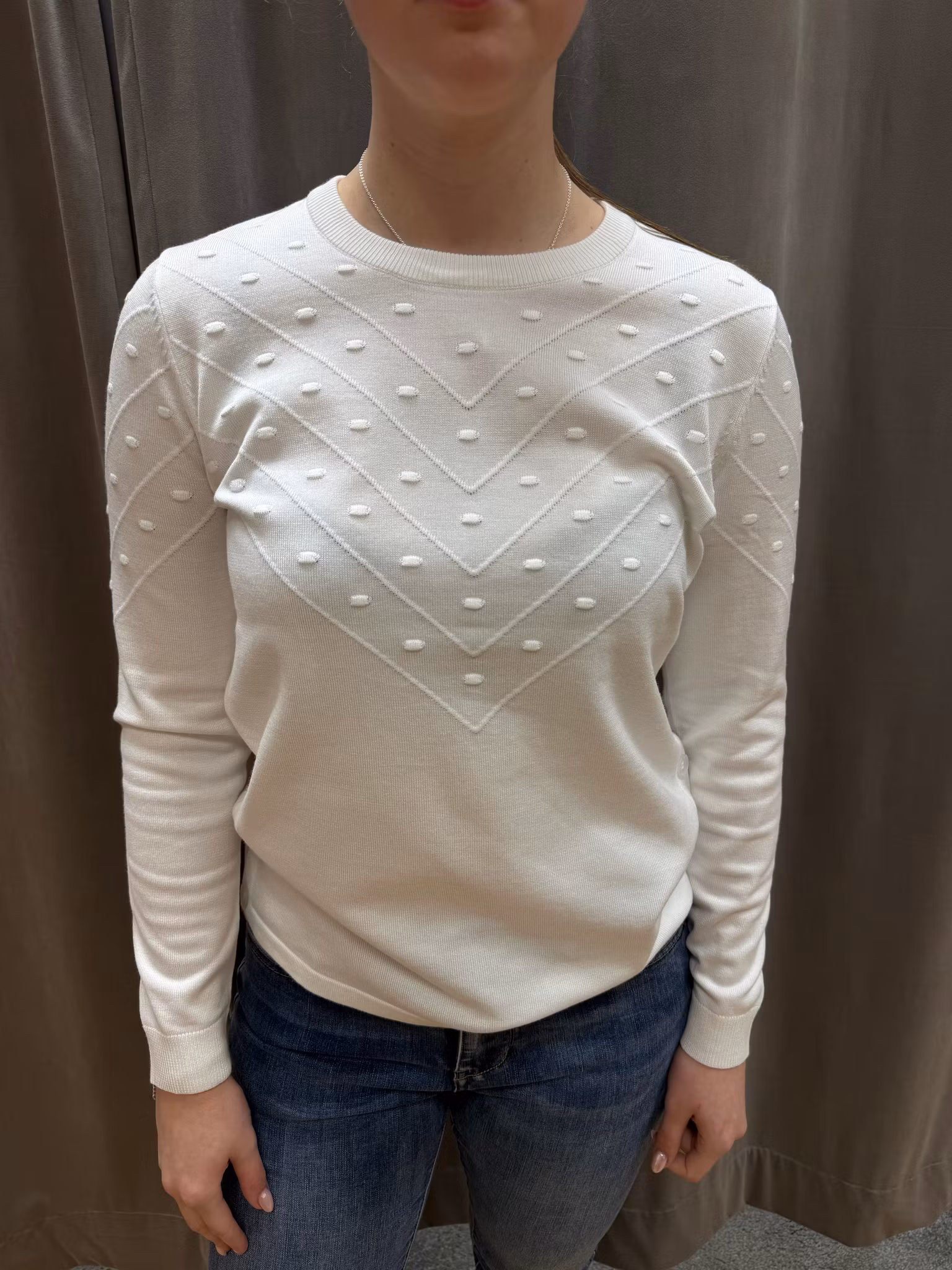 Mjuk och bekväm stickad tröja med rund halsringning och lång ärm. Modellen har en figurnära men avslappnad passform som gör den lätt att bära både instoppad och löst över byxa eller kjol. Den dekorativa strukturen framtill ger ett elegant uttryck samtidigt som materialet känns skönt mot huden. En mångsidig tröja som passar lika bra till vardag som till en mer uppklädd stil.