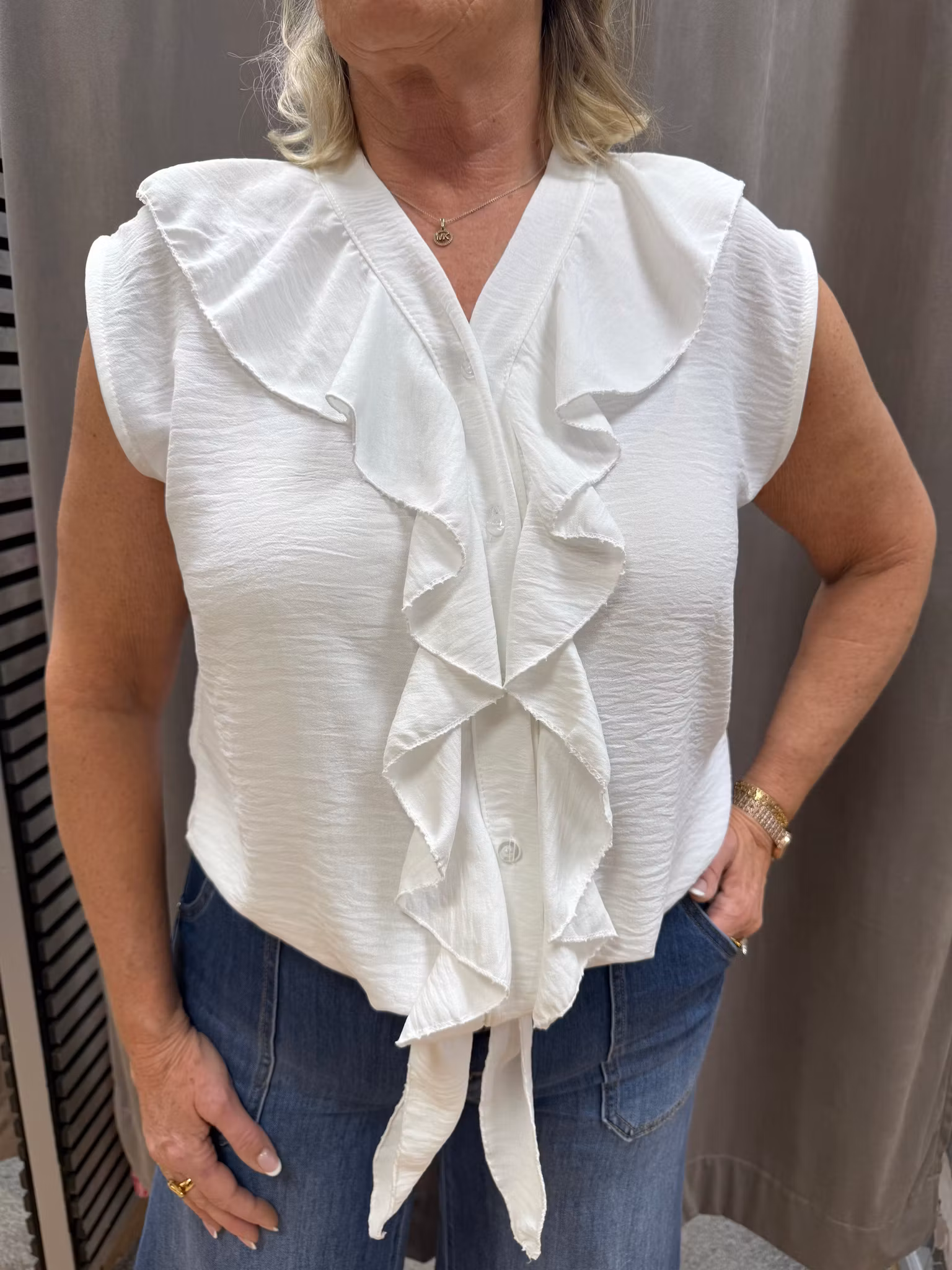 Ett stilrent och feminint linne i en vacker vit nyans med dekorativa volanger framtill som ger plagget en elegant och romantisk känsla. Den mjuka V-ringningen tillsammans med de lagerlagda volangerna skapar ett smickrande fall och ger linnet ett livfullt uttryck.