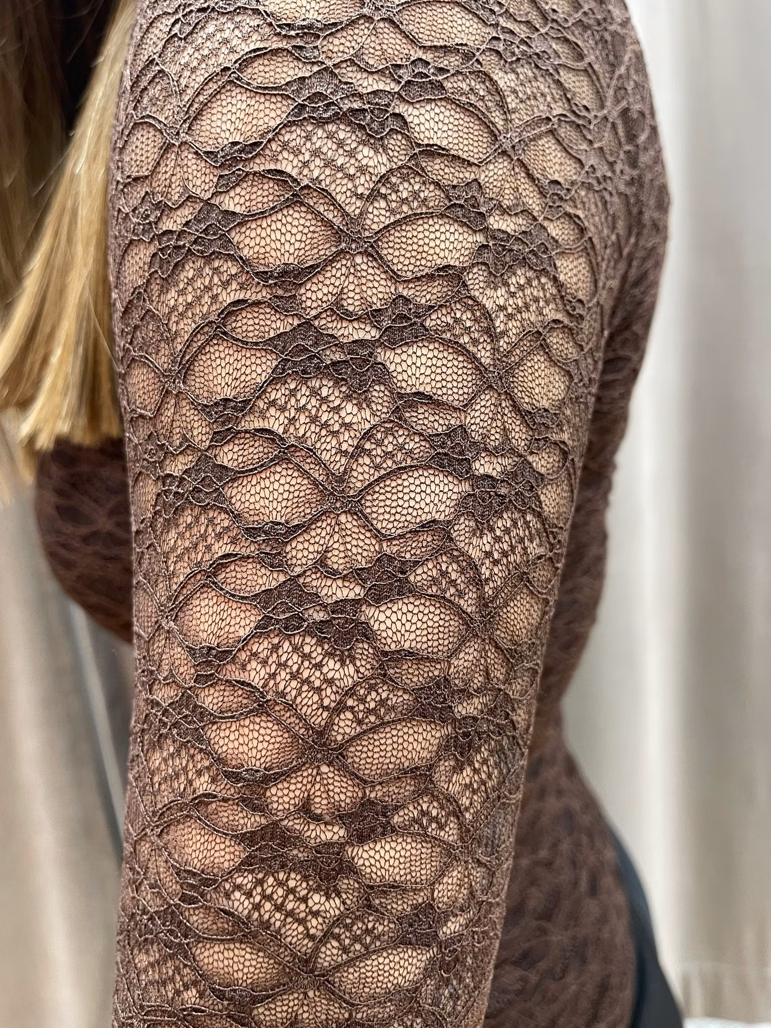 Brun spetstopp med lång ärm i spetsmönstrat stretchtyg. Tyget är genombrutet, modellen bär ett linne under toppen.
