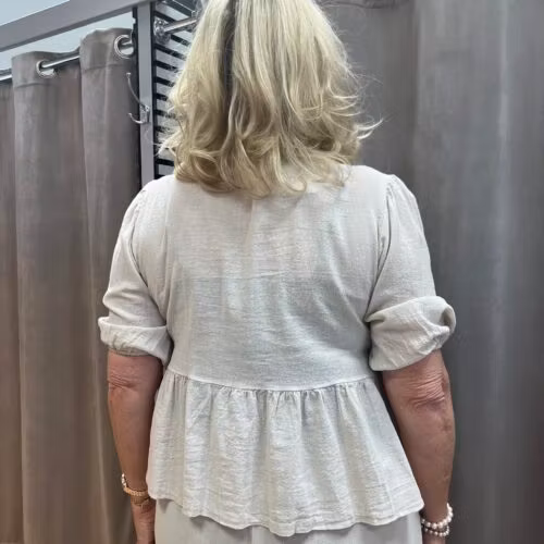 Beige knytblus i linne 499 kr Storlek S/M L/XL I lager. Lägg i korgen Lagersaldo: Artikelnummer: 44 Leverantör: Happi Produktbeskrivning En söt beige knytblus i linne. Passande med eller utan linne undertillModellen är 172 cm och bär storlek L/XL.Material: 50% linne, 50% bomull