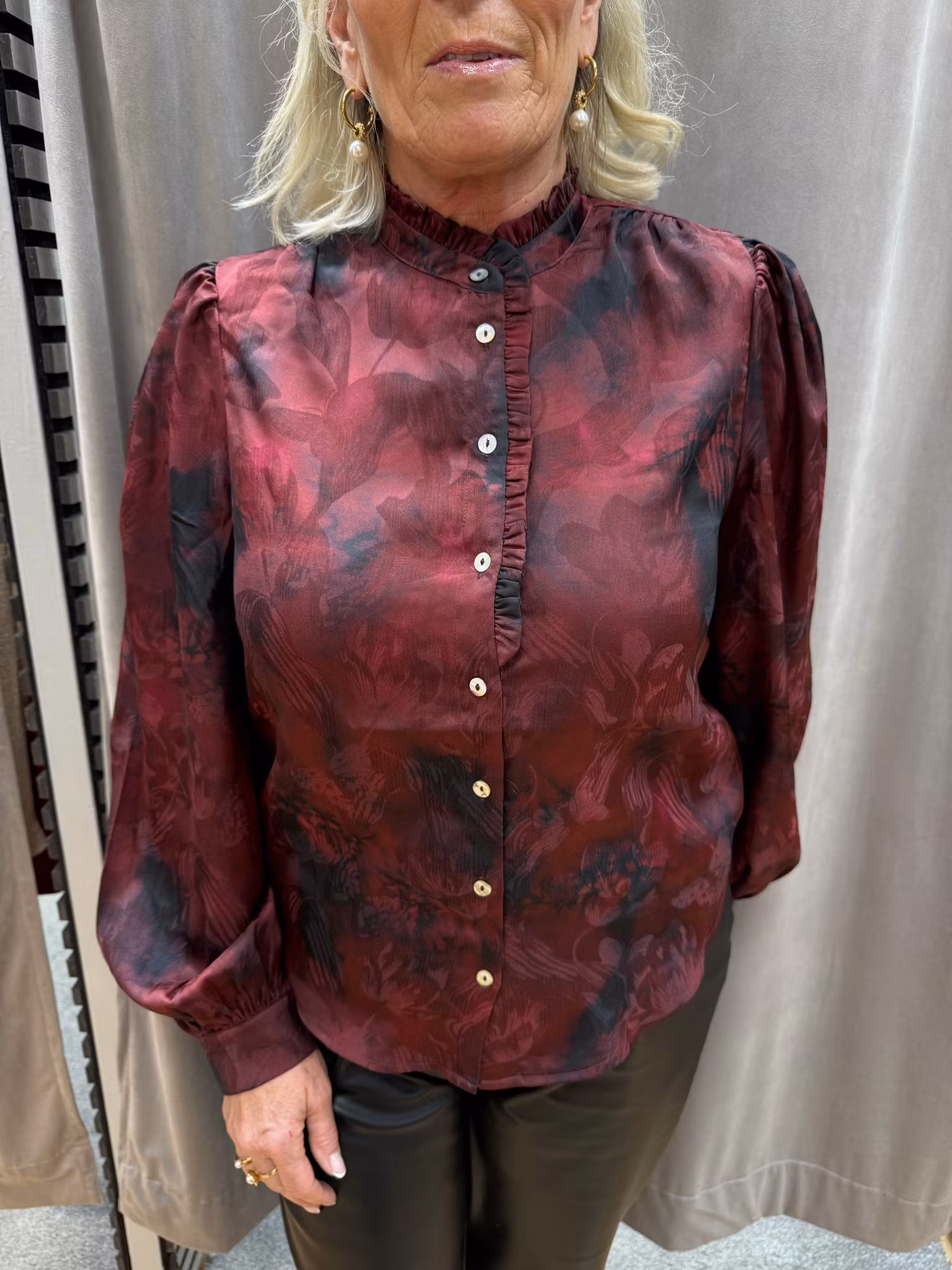 Elegant blus i satin med vackert blomtryck i vinröda och mörka toner. Blusen har ståkrage med diskret volangkant, knäppning framtill och långa puffärmar som ger en stilfull och feminin siluett. Det mjuka, glansiga materialet faller snyggt och gör plagget perfekt både till vardag och fest. Matcha blusen med kjol, kostymbyxor eller skinnbyxor för en modern och tidlös look. En idealisk festblus, höstblus och damblus för dig som vill ha både stil och komfort.