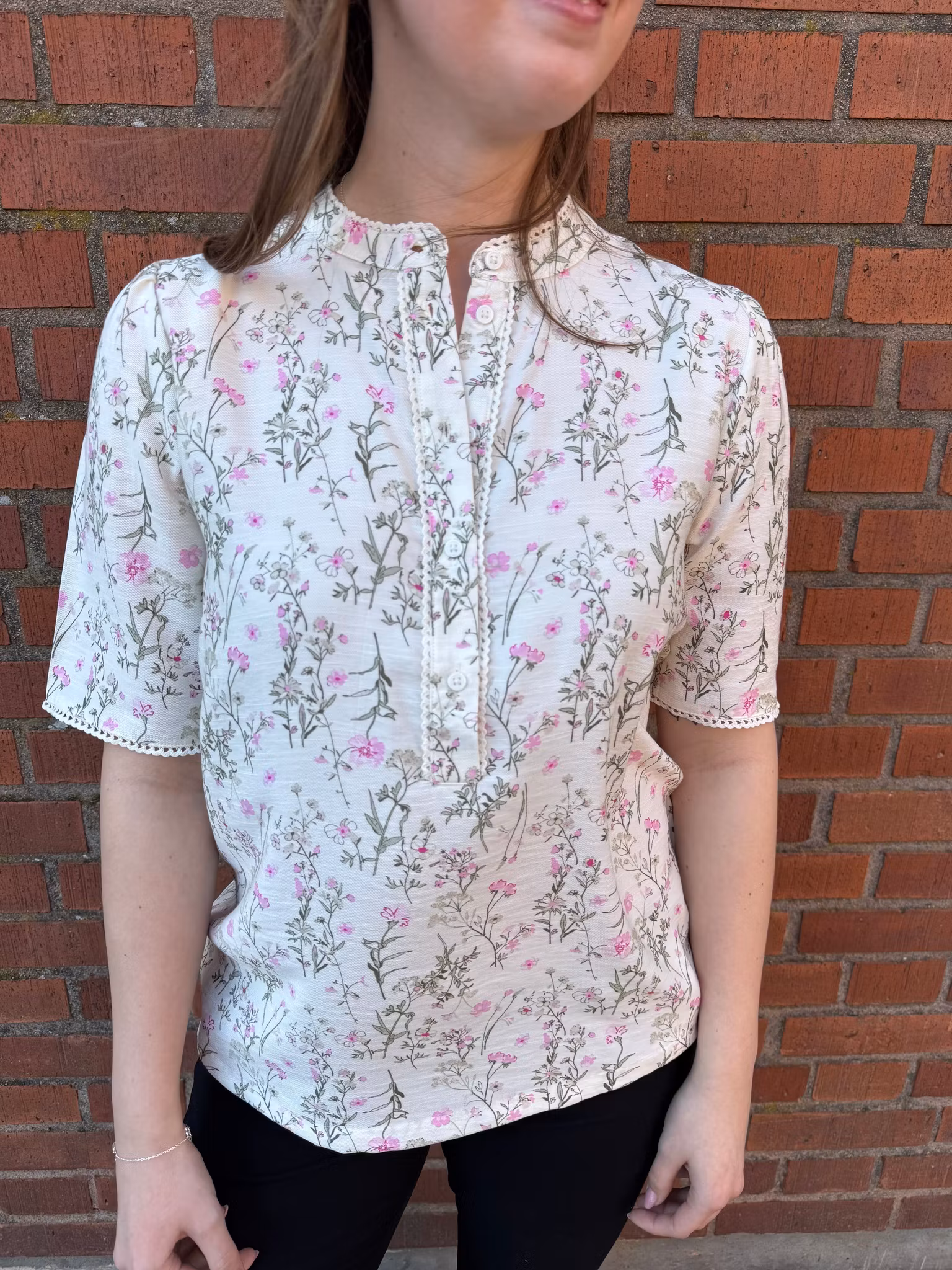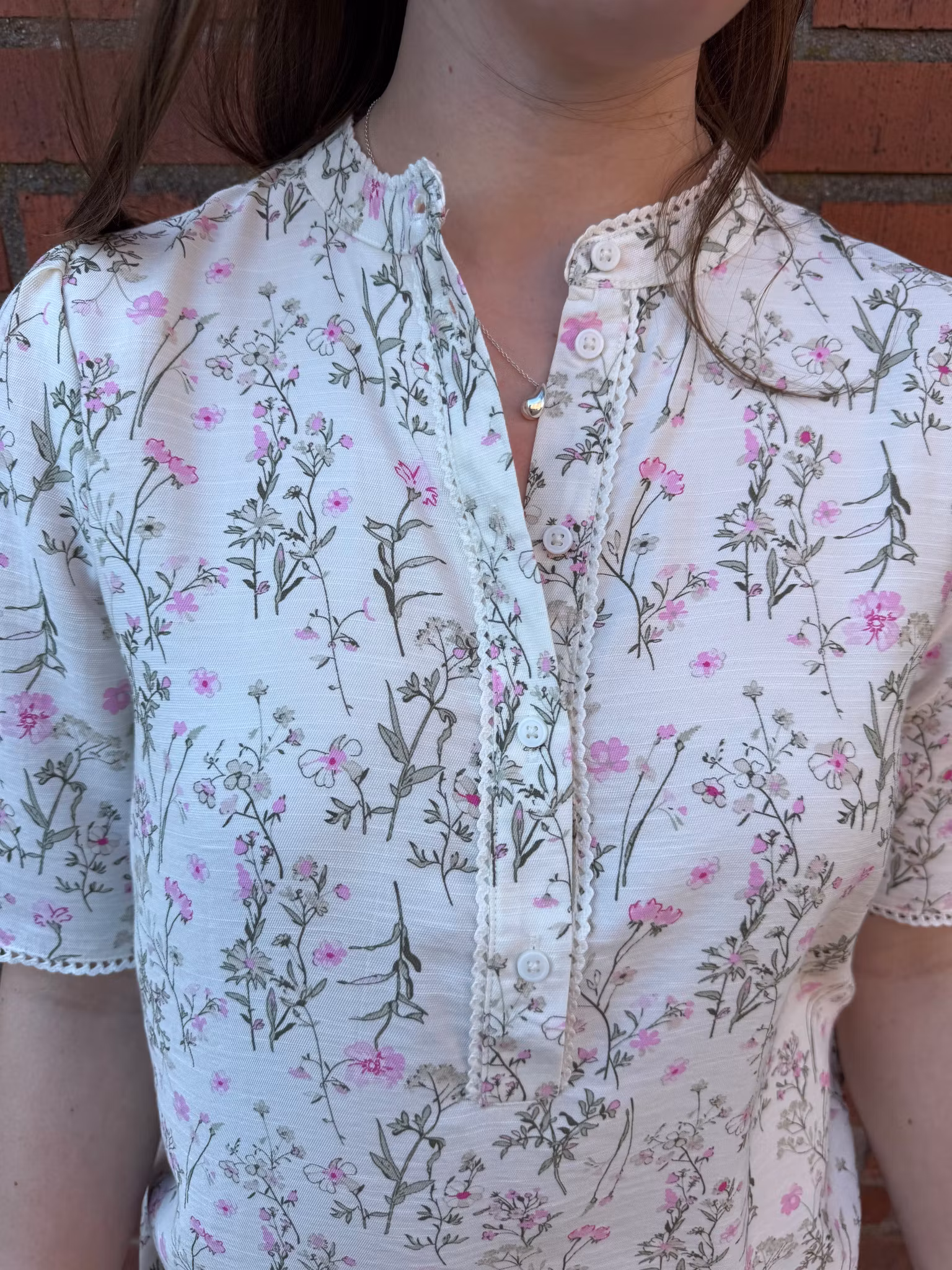 En feminin och elegant cremevit blus med blommönster som ger en mjuk och romantisk känsla. Blusen har ett vackert blommigt mönster i rosa och gröna toner som skapar ett somrigt och stilrent uttryck.