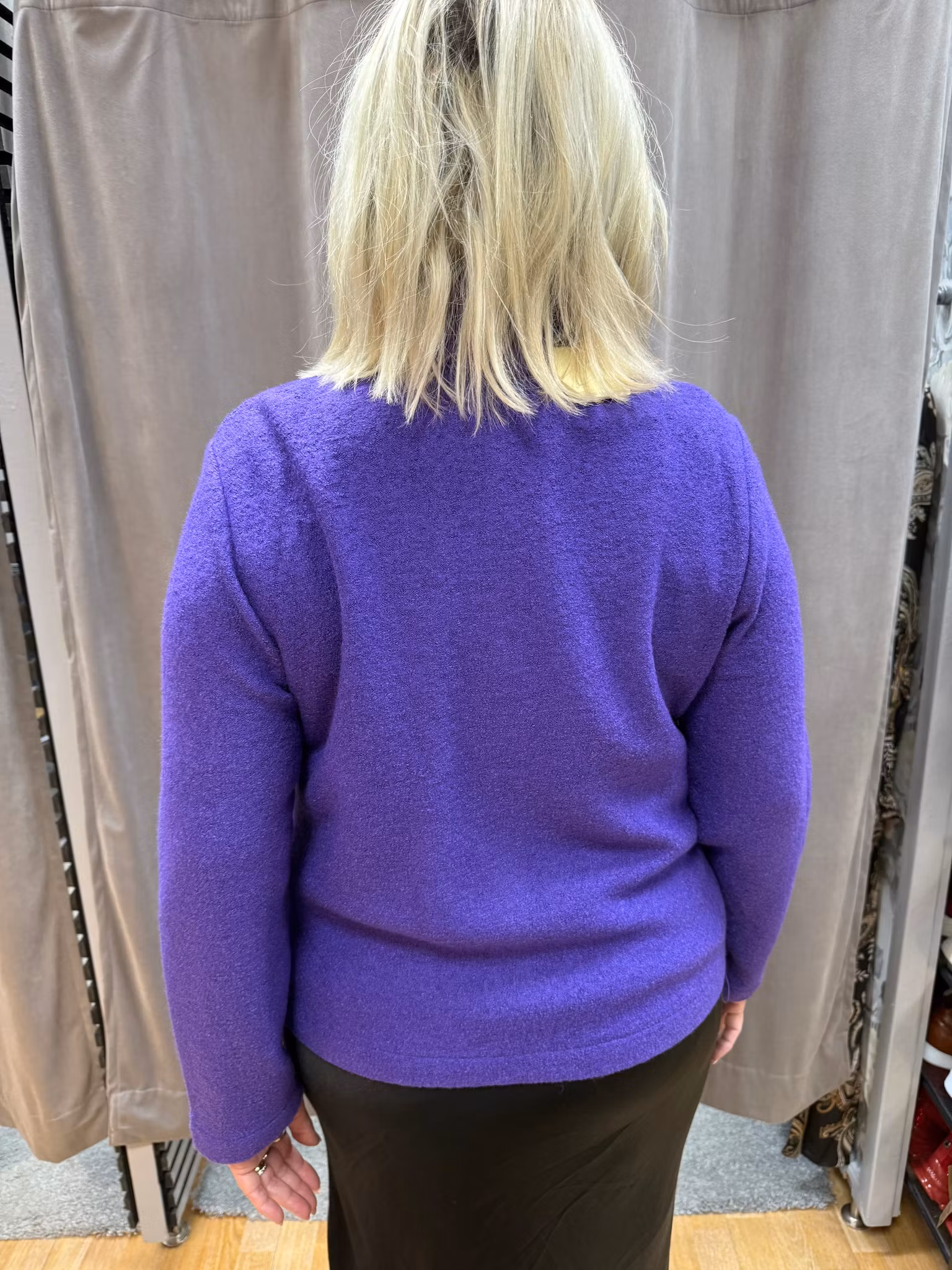 En elegant lila jacka i mjukt strukturmaterial med ståkrage och dekorativa knappar. Den raka passformen och de diskreta fickorna gör den perfekt både till vardag och fest. En färgstark jacka som lyfter varje outfit.