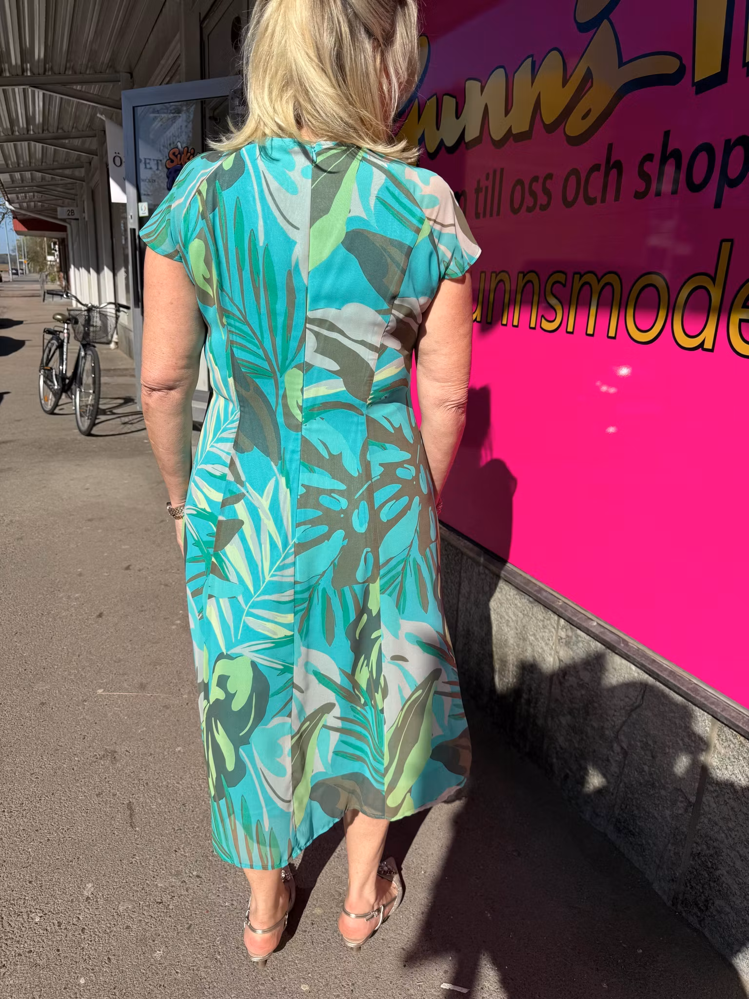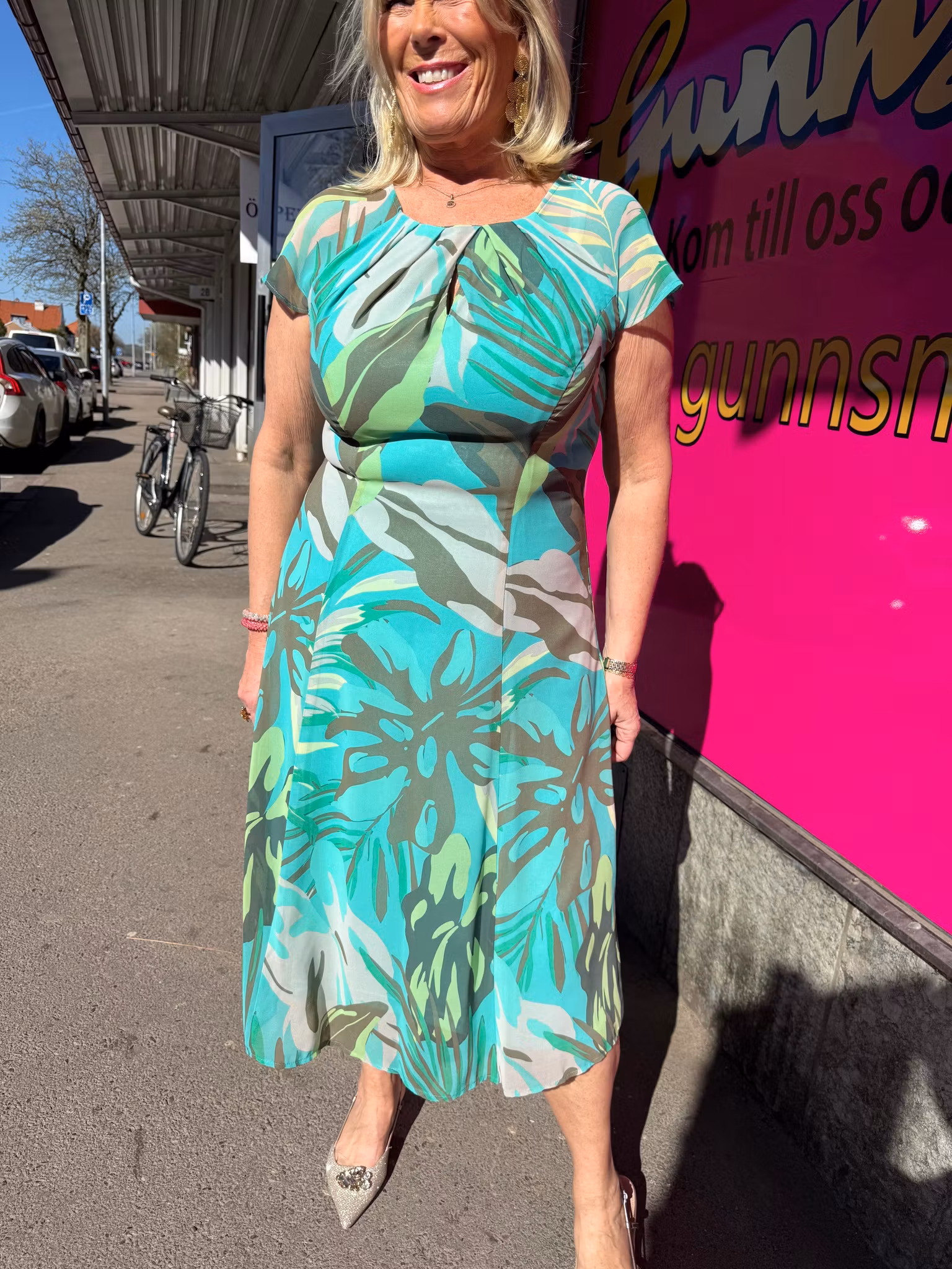 En elegant klänning i vackra gröna och turkosa nyanser med ett mjukt, bladliknande mönster som ger en fräsch och somrig känsla. Den figurnära passformen framhäver silhuetten på ett smickrande sätt, medan det följsamma tyget ger både komfort och rörelsefrihet.