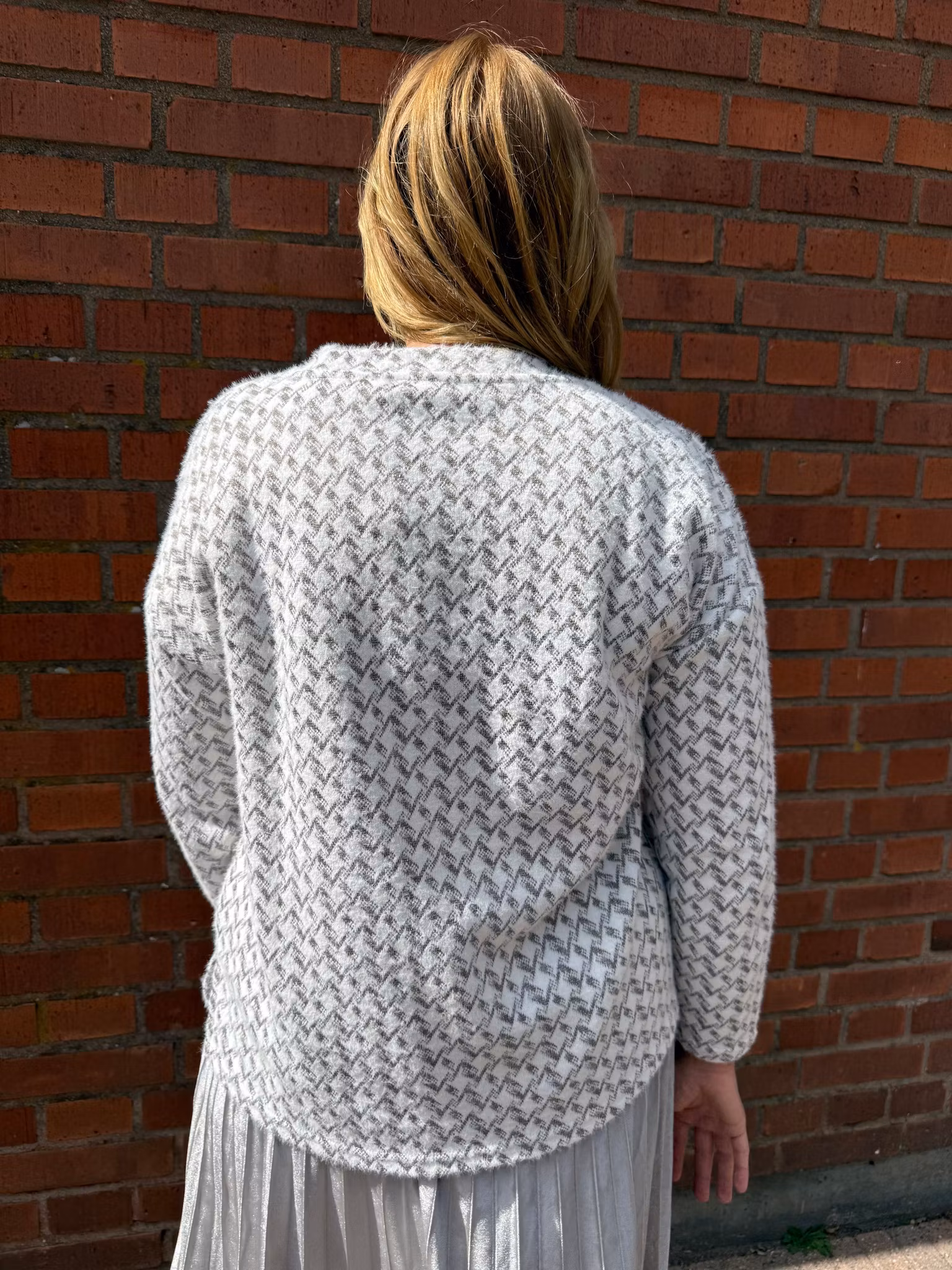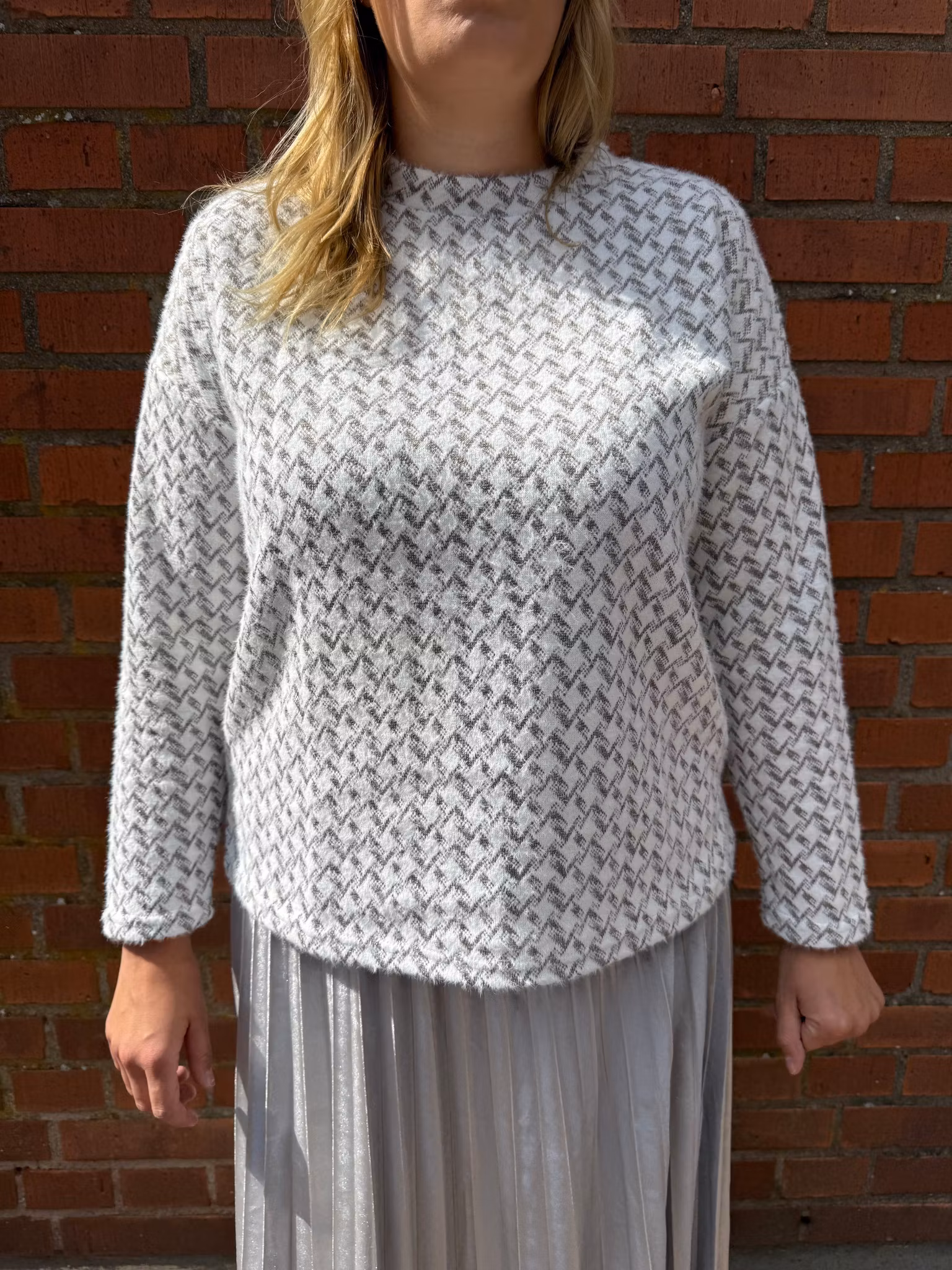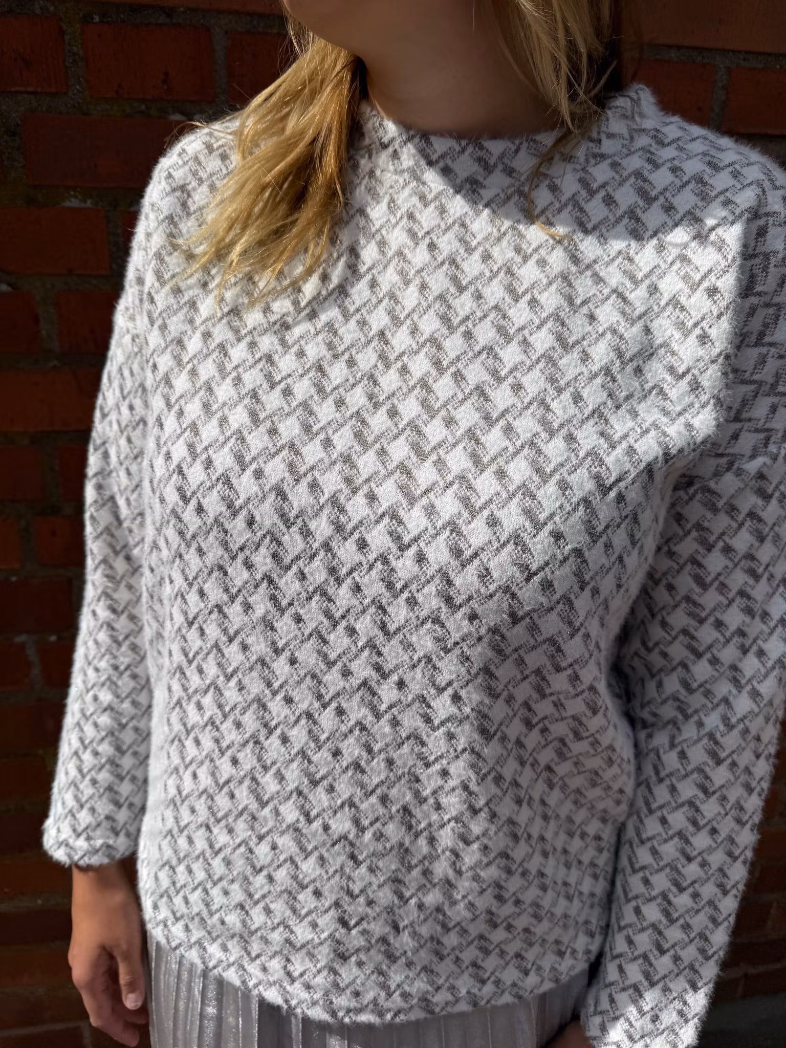 Mjuk stickad tröja i vitt med grått geometriskt mönster och diskreta glitterdetaljer som ger en elegant touch. Tröjan har lång ärm, rak passform och rund halsringning. En stilren men festlig tröja som passar lika bra till vardags som till festligare tillfällen.