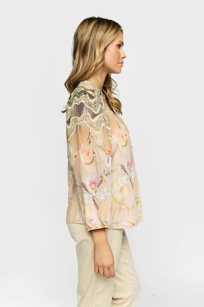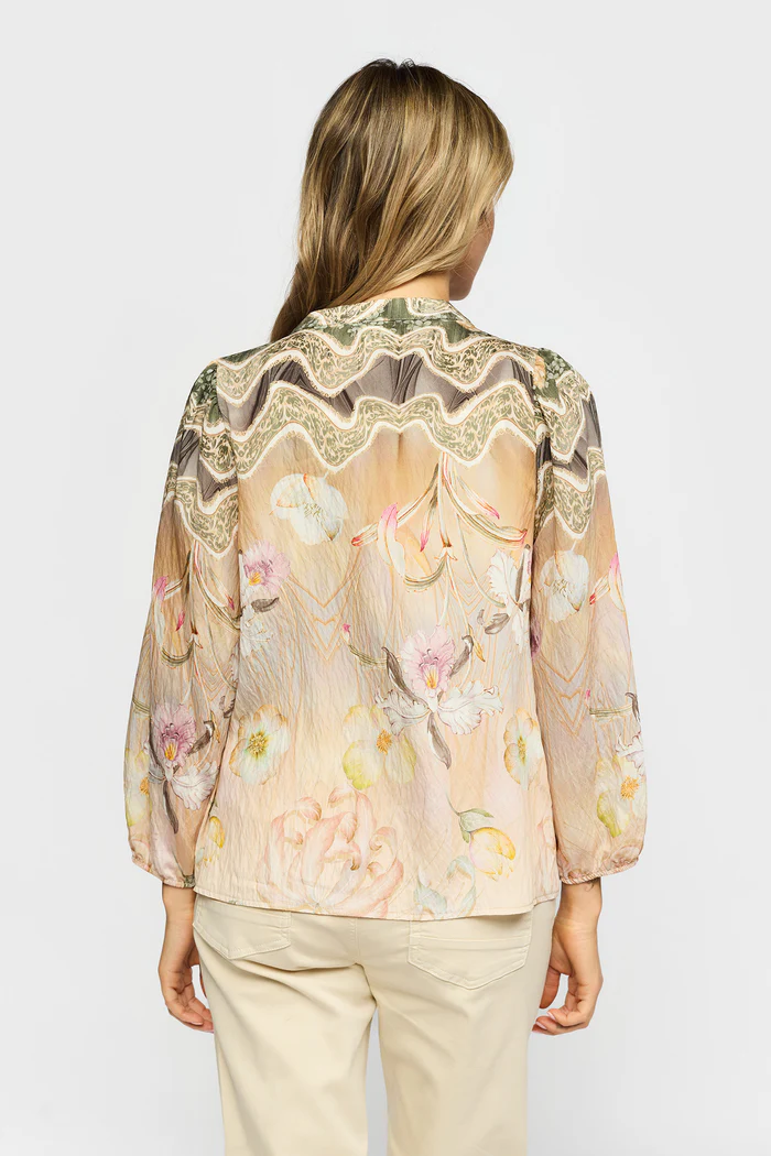 En elegant och feminin blus i ett mjukt, luftigt material som faller vackert mot kroppen. Blusen har ett konstnärligt blomsterprint i harmoniska naturtoner som ger ett exklusivt och sofistikerat uttryck. Den dekorativa bården över axlarna och runt halsringningen skapar en fin kontrast och ger plagget en unik karaktär.
