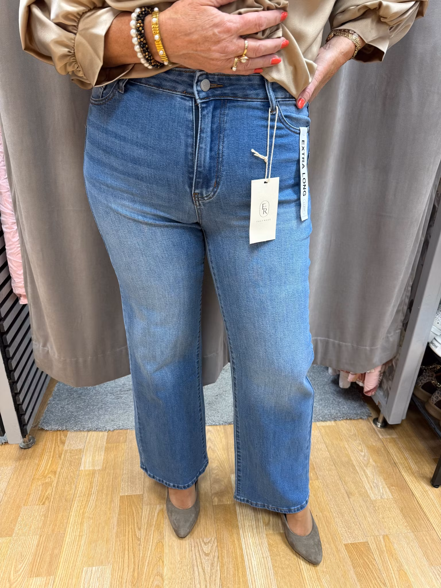 Smickrande jeans med rak, lätt utsvängd benvidd och extra lång innerbenslängd – perfekta för dig som vill ha en elegant siluett med längd. Modellen är designad för att ge en formande effekt över mage och höfter samtidigt som den sitter bekvämt hela dagen.