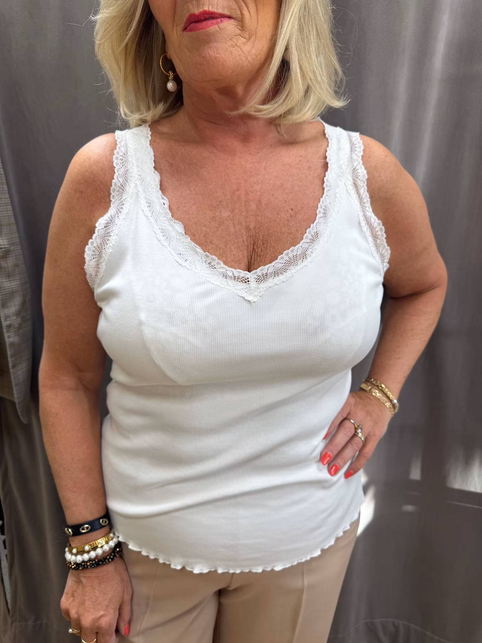 Ett feminint och stilrent linne i mjuk, ribbad kvalitet som sitter bekvämt och följsamt på kroppen. Den vackra spetskanten runt ringning och axelband ger en romantisk och elegant känsla, samtidigt som den vita nyansen skapar ett fräscht och somrigt uttryck.