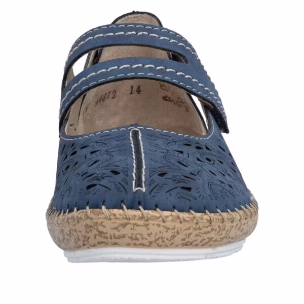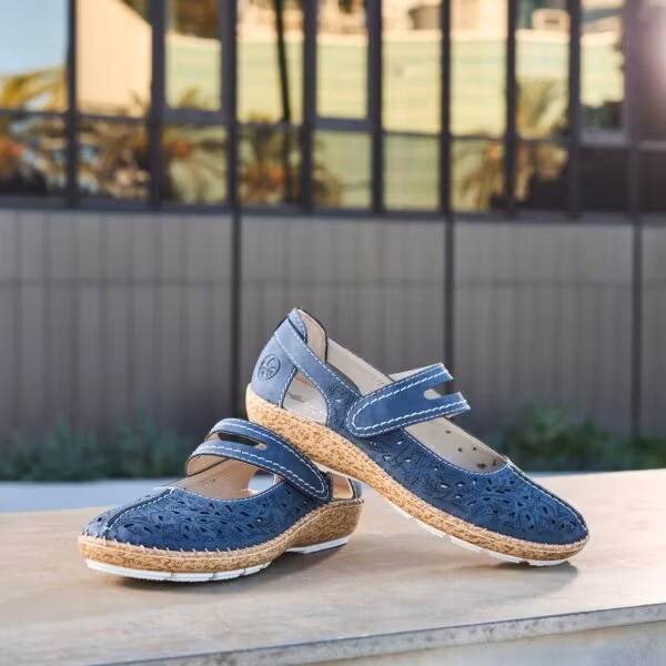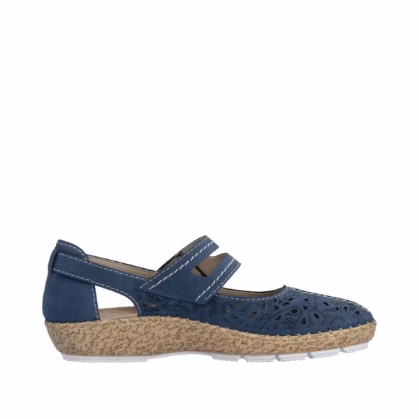 Rieker skor för dam i blått. Dessa skor är designade med fokus på både stil och komfort i vardagsbruk. Kardborreknäppningen över vristen gör skon enkel att ta på och av och ger en bra passform. Invändigt är skon utrustad med en mjuk lädersula, vilket säkerställer god komfort hela dagen. Yttersulan är utformad med ett mönster som ger ökad stötdämpning och halkskydd.