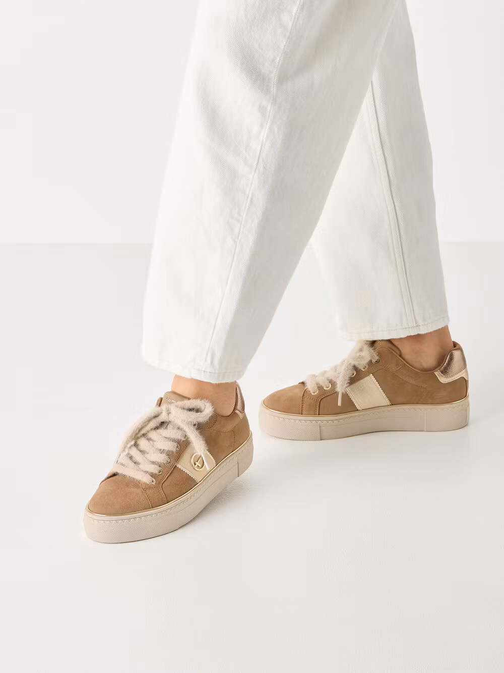 Stilrena och trendiga sneakers i kamelfärgad ton med eleganta gulddetaljer som ger en exklusiv och modern look. Perfekta för både vardag och mer uppklädda tillfällen.