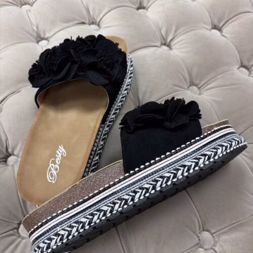 Svarta blomtofflor 499 kr Storlek 36 37 38 39 40 41 I lager. Lägg i korgen Lagersaldo: Artikelnummer: 66 Leverantör: Jörlevik Produktbeskrivning Supersnygga svarta blomtofflor.