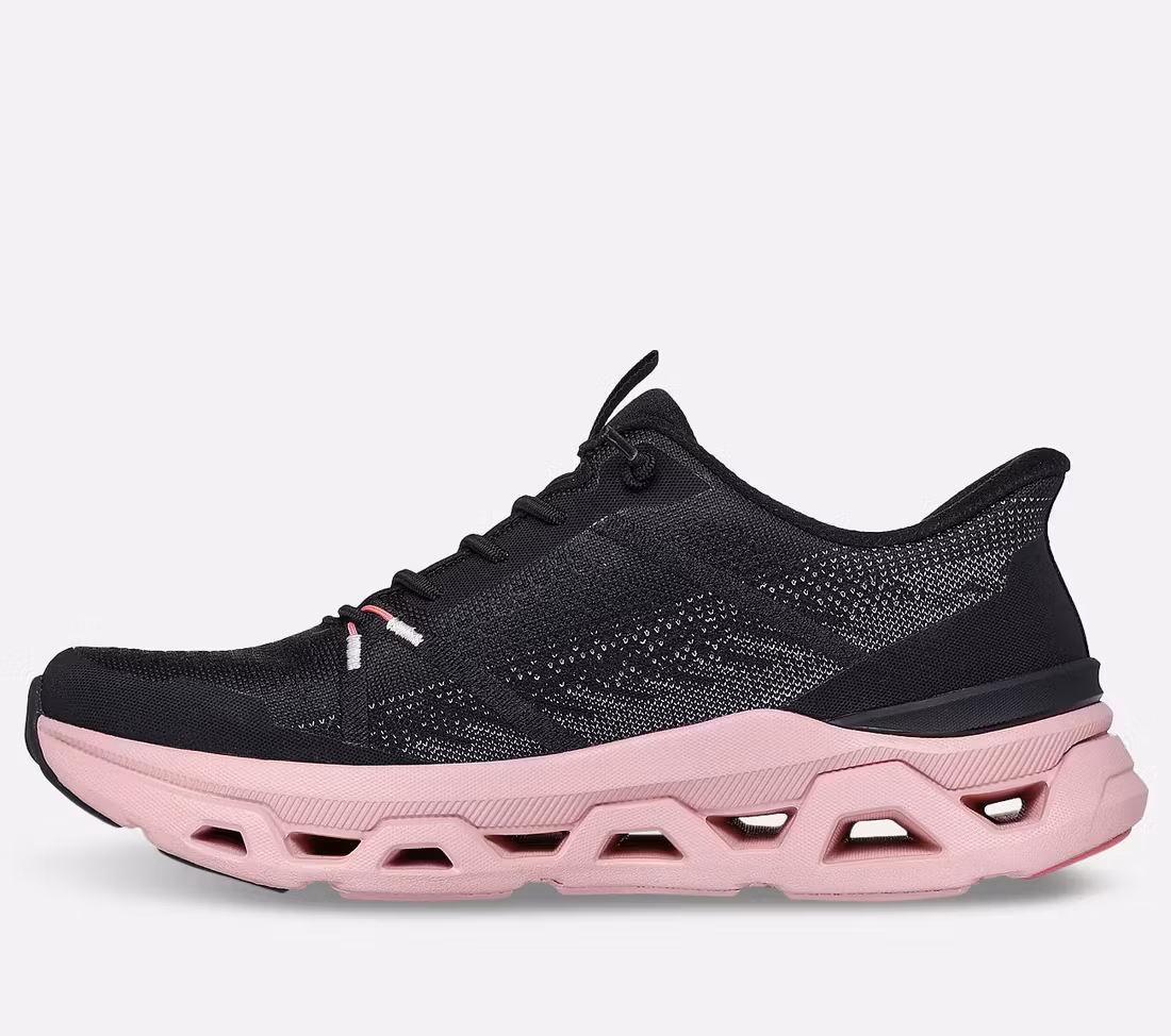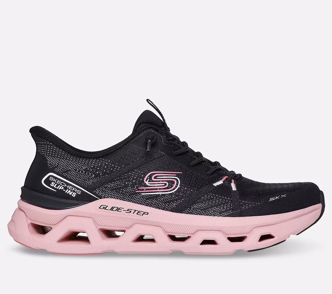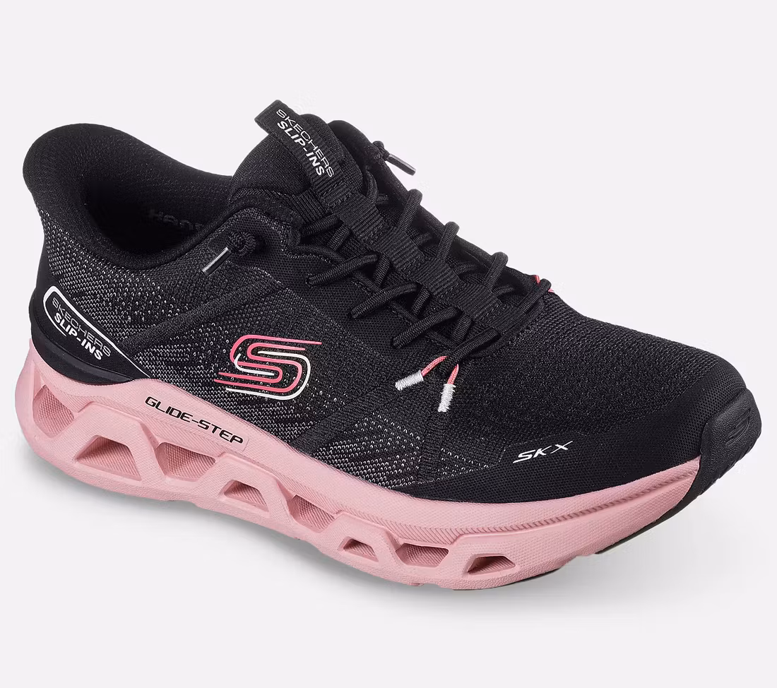 Sportiga och bekväma sneakers från Skechers med innovativ Slip-ins™-design som gör dem enkla att ta på utan att behöva använda händerna. Ovandelen är i svart mesh med rosa detaljer och logga på sidan. Den unika Glide-Step™-sulan i rosa har ett geometriskt mönster som ger bra stötdämpning och energiåtergivning vid varje steg.